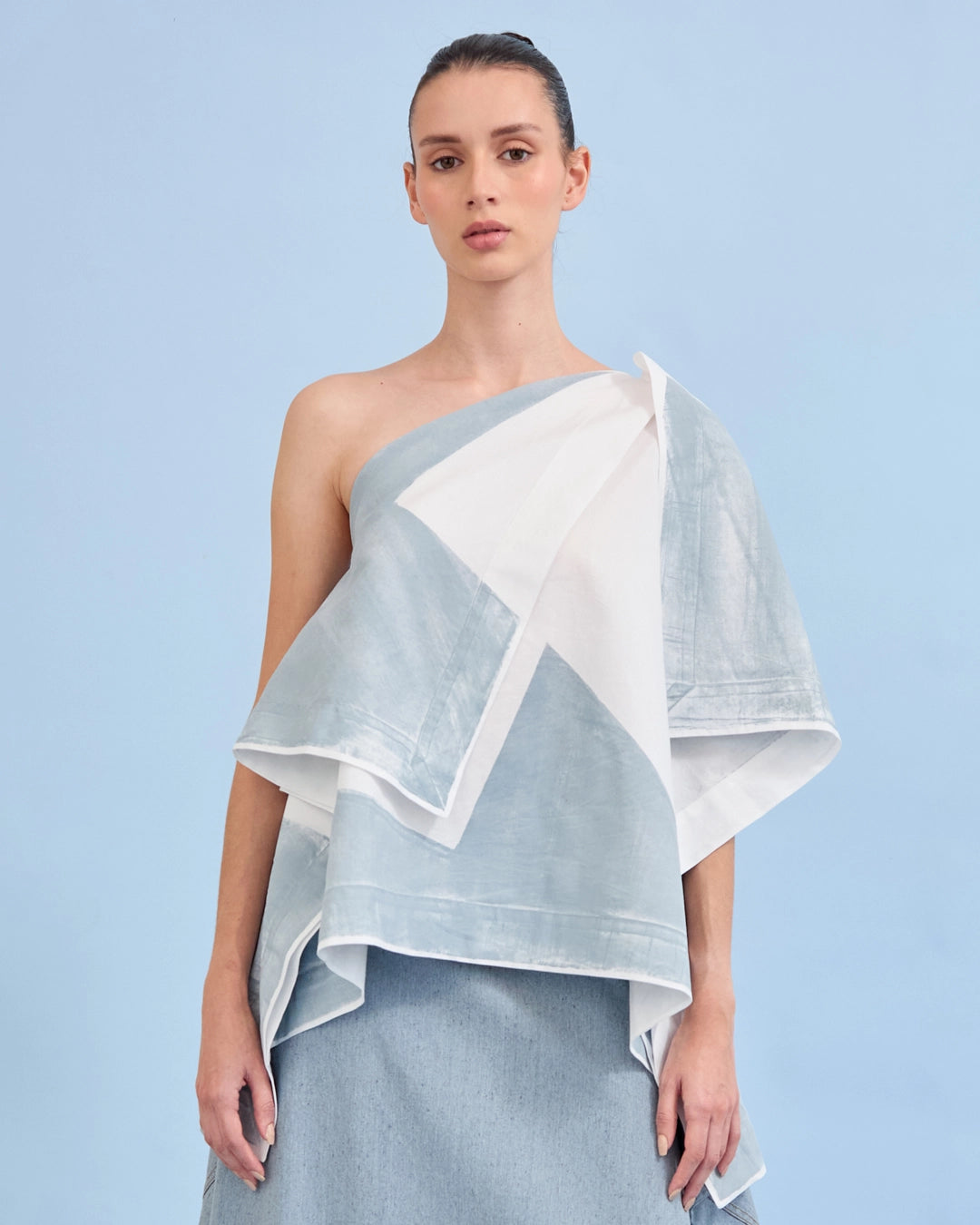 Blusa de un solo hombro con silueta amplia y capas laterales, confeccionada en algodón 100% liviano. Su construcción rectangular reduce residuos textiles y su estampado experimental con pintura a base de agua hace que cada pieza sea única. Diseño colombiano.