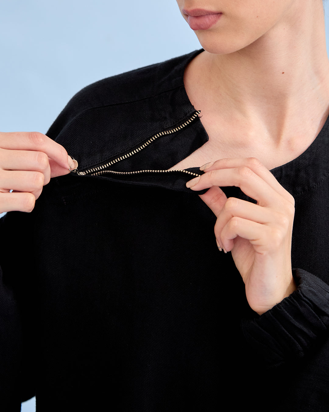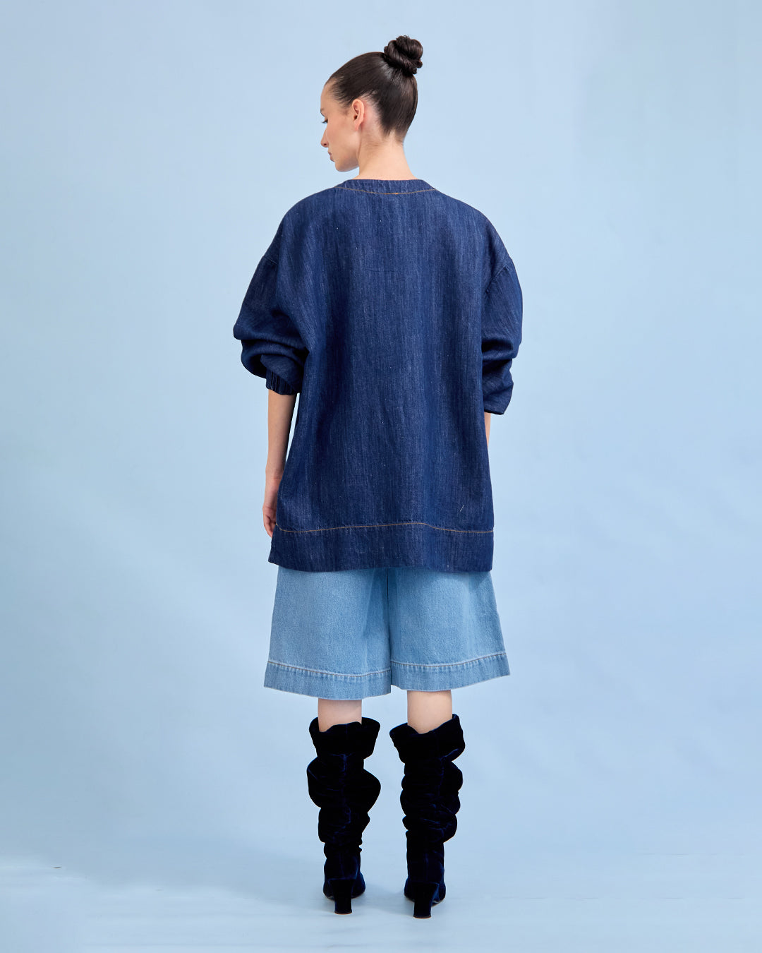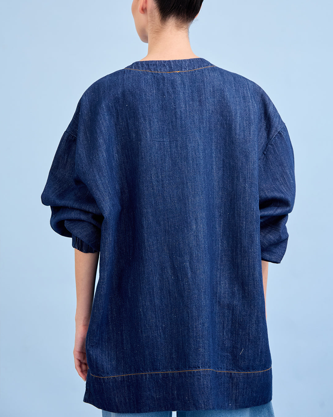 Buso en denim de silueta cuadrada que redefine lo esencial. Confeccionado en una mezcla de algodón y cáñamo. Diseño con cuello redondo y cremallera metálica diagonal. Lleva elásticos en los puños y un ruedo escalonado, más largo en la espalda.