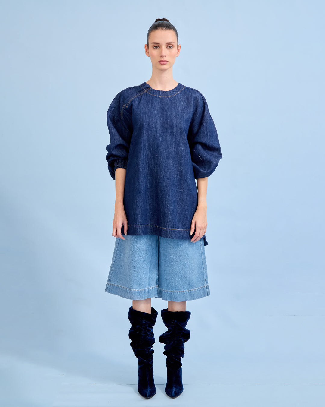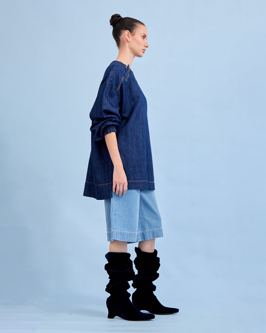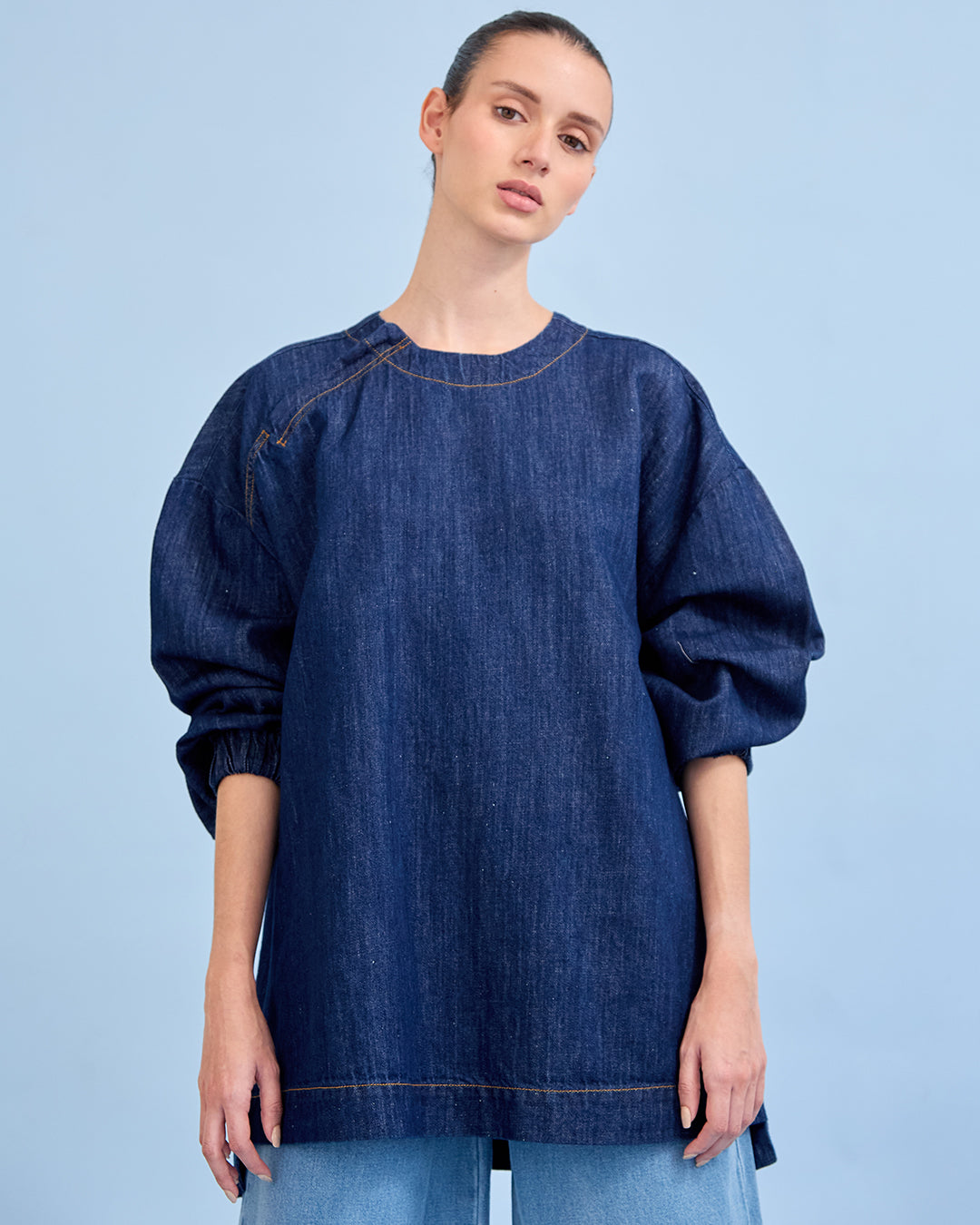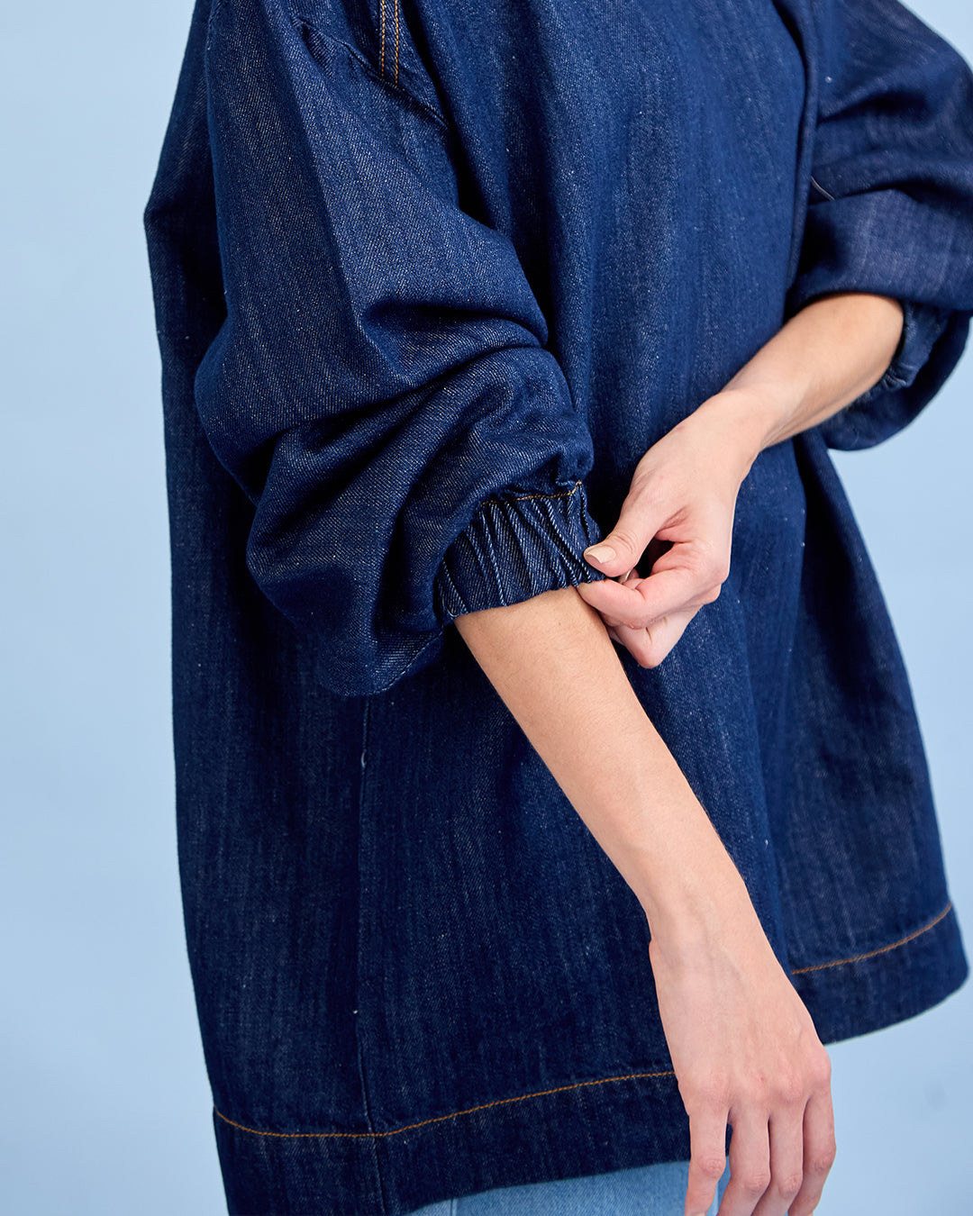 Buso en denim de silueta cuadrada que redefine lo esencial. Confeccionado en una mezcla de algodón y cáñamo. Diseño con cuello redondo y cremallera metálica diagonal. Lleva elásticos en los puños y un ruedo escalonado, más largo en la espalda.