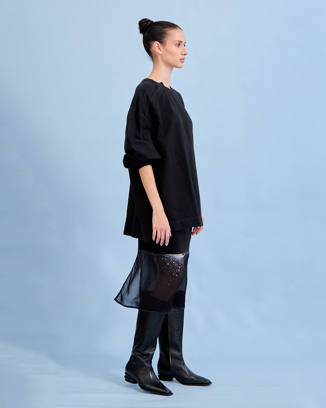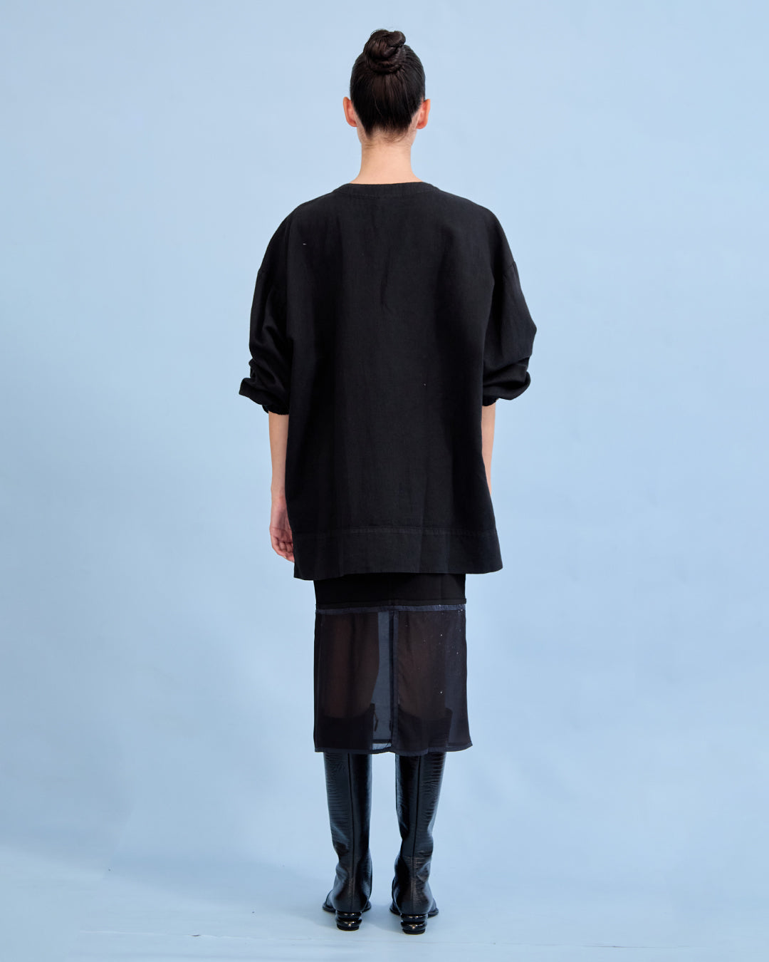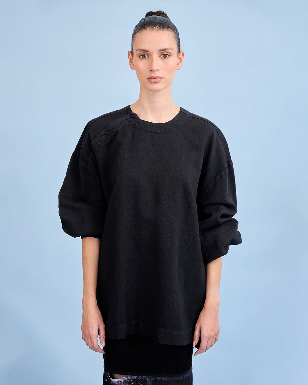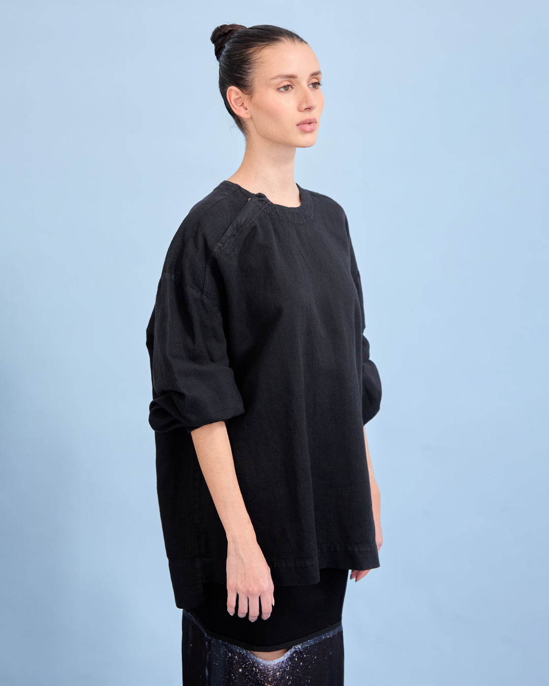 Buso en mezcla de algodón y cáñamo con silueta cuadrada, cuello redondo y cremallera diagonal. Lavado frosted de bajo impacto que aporta textura visual única. Prenda sin género, hecha en Colombia.