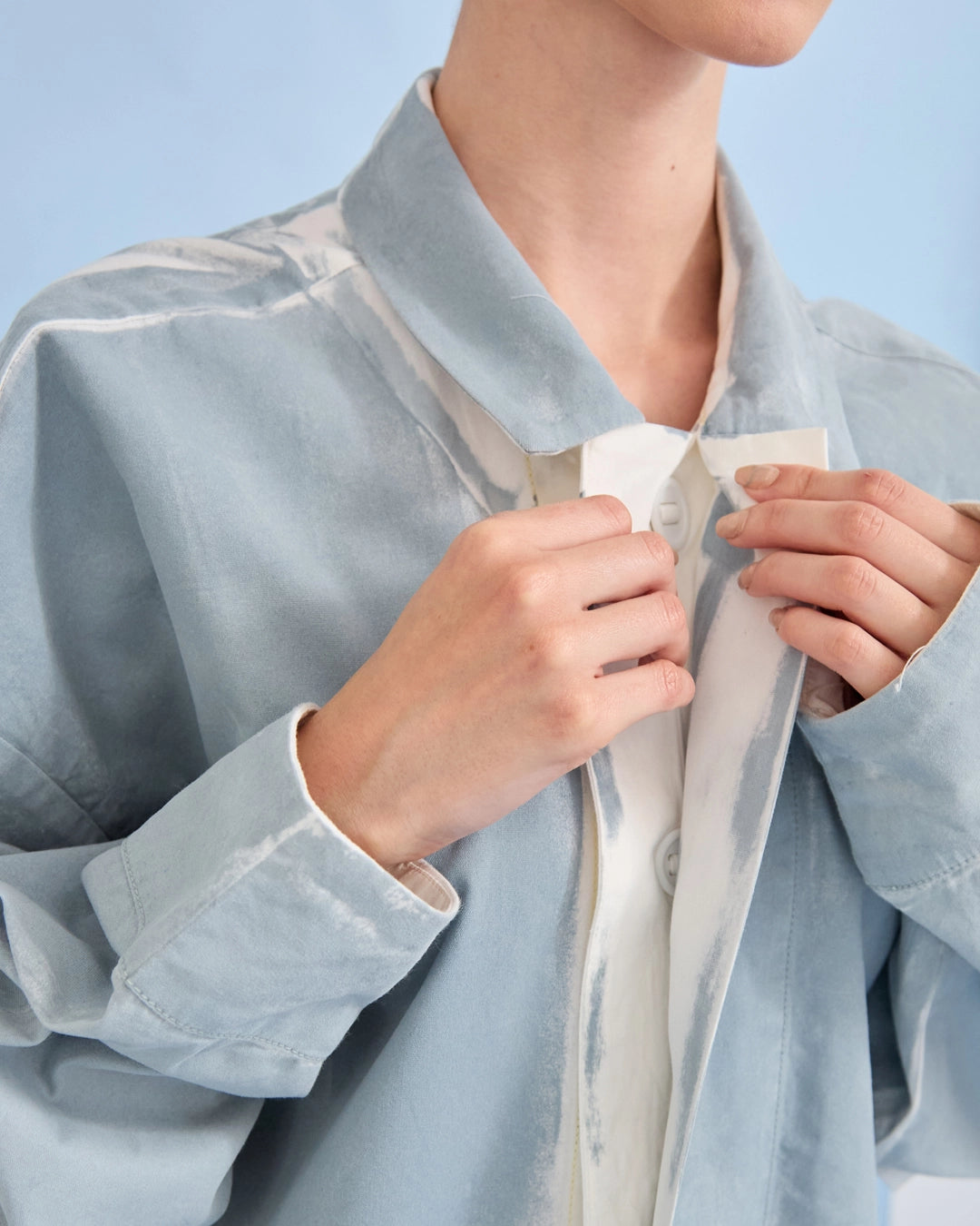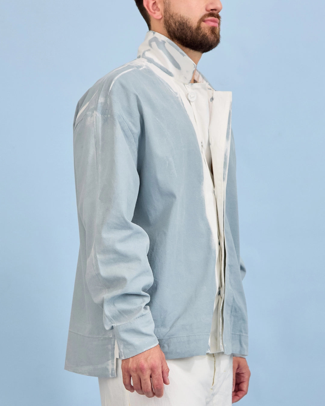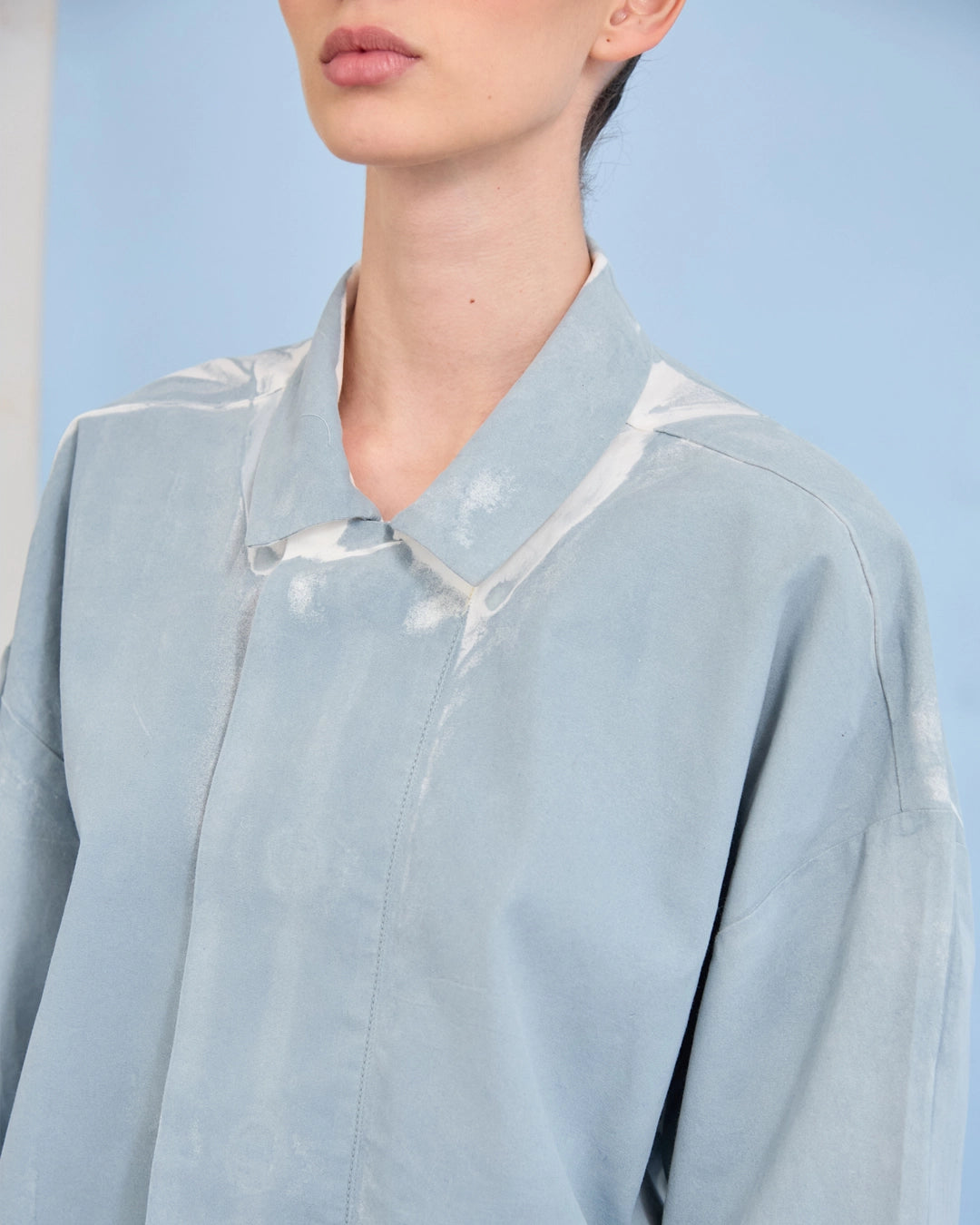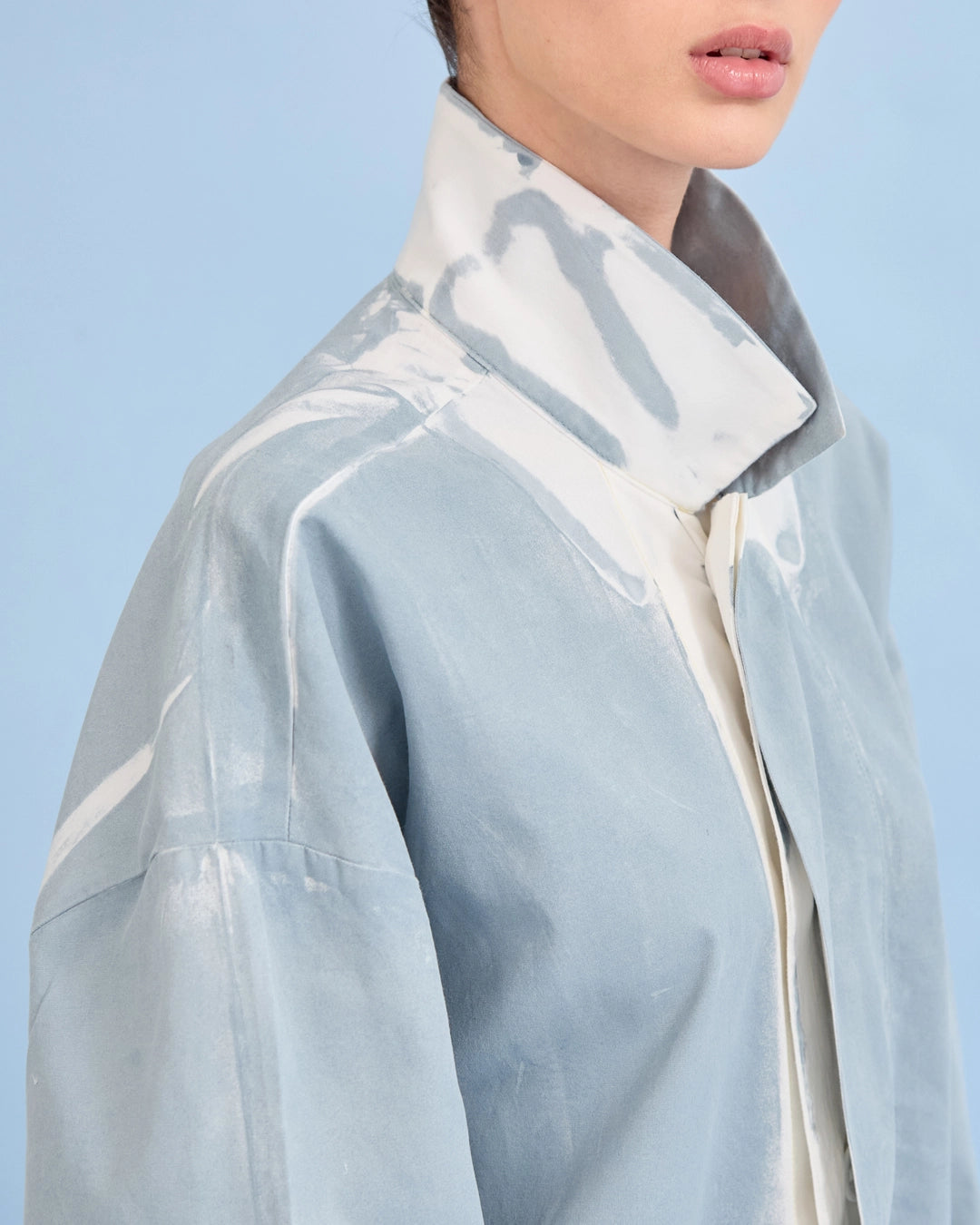 Base en color blanco hueso con estampado experimental azul claro que cubre la superficie de la prenda armada, dejando ver el color original de la tela en los pliegues, en el revés del cuello y en el interior de la perilla.