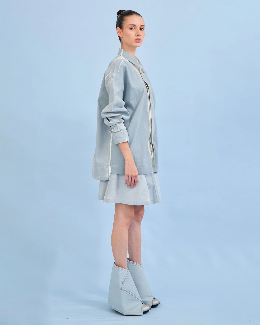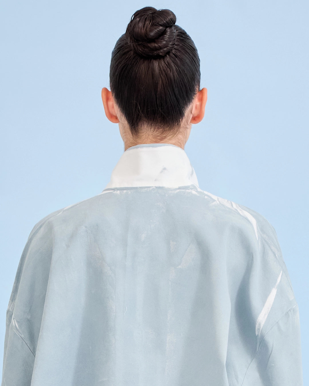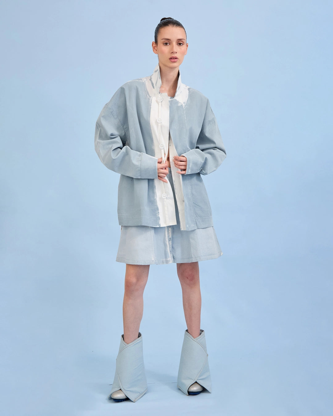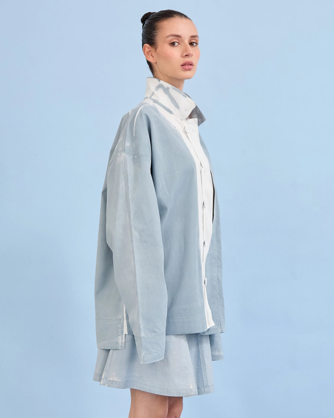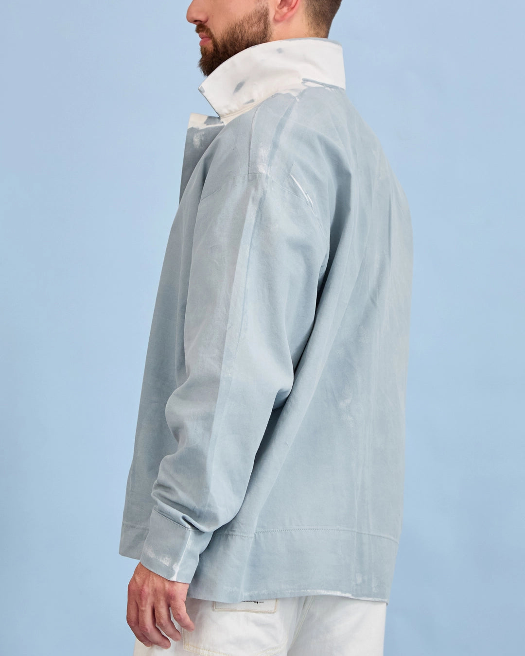Base en color blanco hueso con estampado experimental azul claro que cubre la superficie de la prenda armada, dejando ver el color original de la tela en los pliegues, en el revés del cuello y en el interior de la perilla.