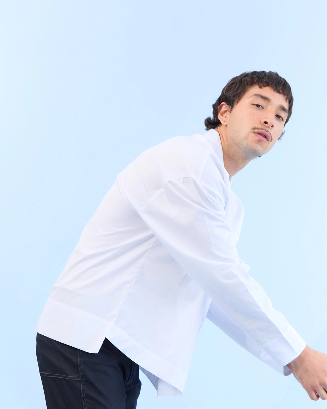 La silueta boxy de esta camisa está pensada para brindar libertad de movimiento y frescura. Tiene cuello camisero y una perilla ancha en el frente que oculta un detalle único: tres botones fijados con una banda textil que los atraviesa. Los ojales son también elaborados a partir de pliegues en el textil, aportando un acabado limpio. El ruedo escalonado es más largo en la espalda, con cortes angulares en los costados. Esta prenda sin género, hecha en Colombia, es ideal para quienes valoran la funcionalidad, el diseño contemporáneo y los materiales nobles.