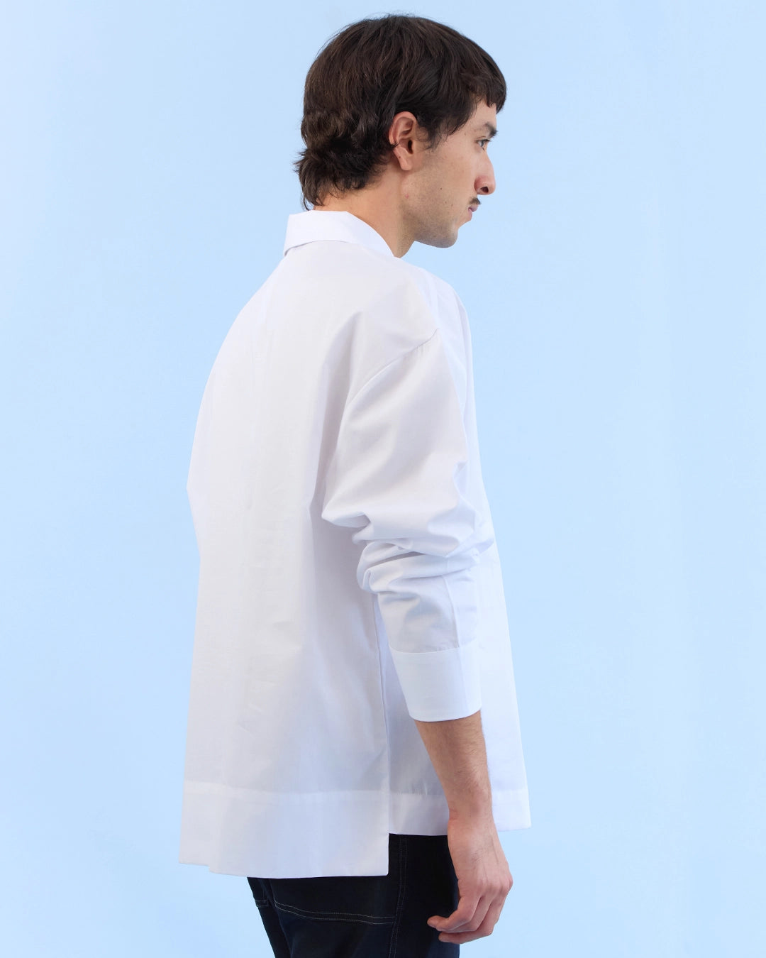 Camisa blanca de silueta cuadrada, confeccionada en tejido plano 100% algodón con microtextura. Diseñada con un ajuste amplio, cómodo y estructurado