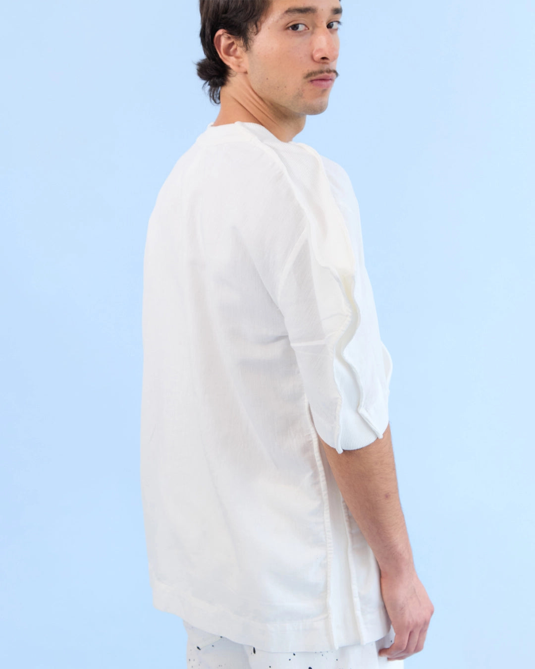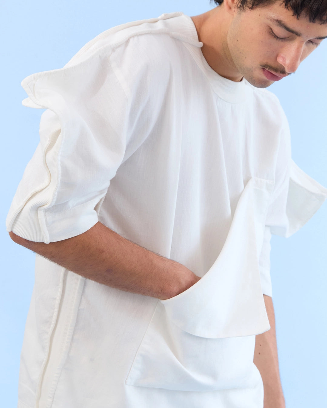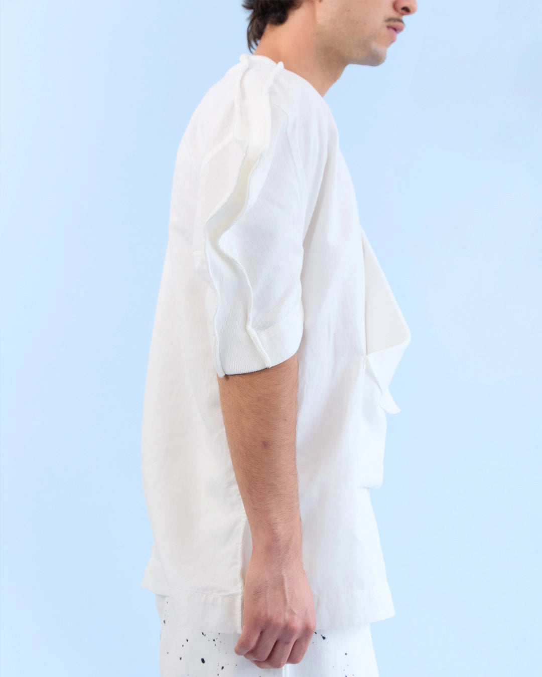 Camiseta unisex color marfil, de silueta amplia y construcción experimental. Estpá elaborada en una mezcla natural de algodón y cáñamo. Su diseño parte de varios rectángulos de tela que se ensamblan con fuelles de rib de algodón para formar el cuerpo y las mangas como cubos, logrando una estructura geométrica con apariencia escultórica. Incluye un bolsillo de parche frontal sobredimensionado.