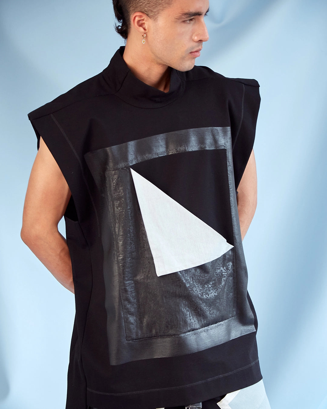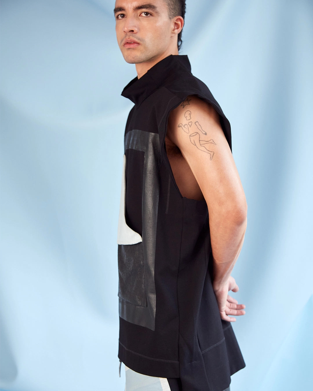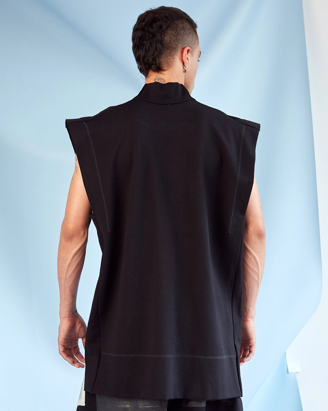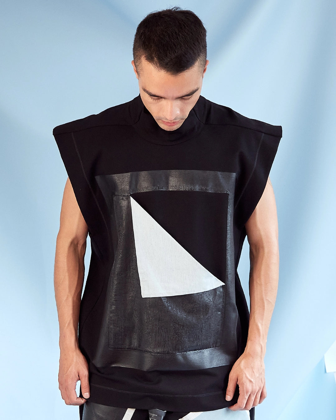 Camisilla en color negro, diseñada bajo la filosofía de la línea rectangular, que busca crear prendas con la menor cantidad de curvas posibles para reducir al máximo el desperdicio de tela.