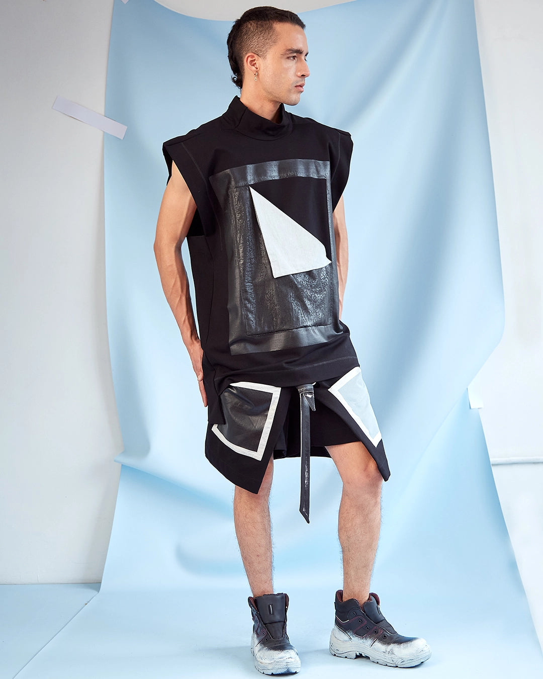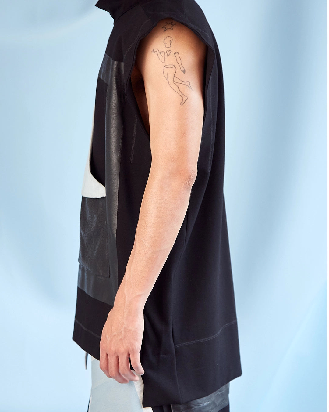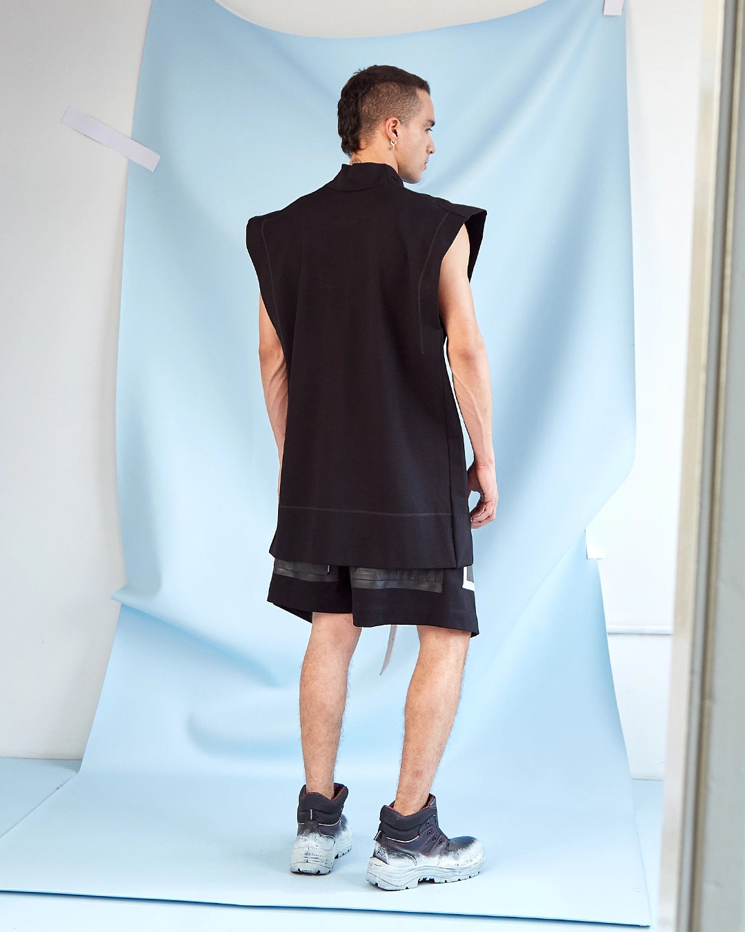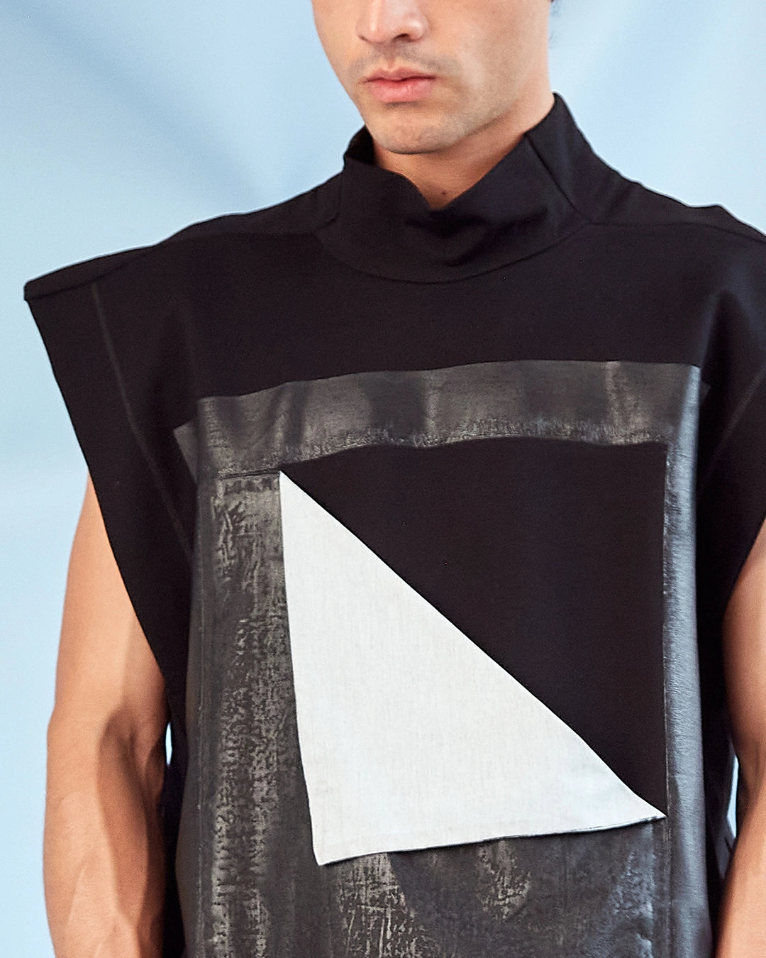 Camisilla en color negro, diseñada bajo la filosofía de la línea rectangular, que busca crear prendas con la menor cantidad de curvas posibles para reducir al máximo el desperdicio de tela.