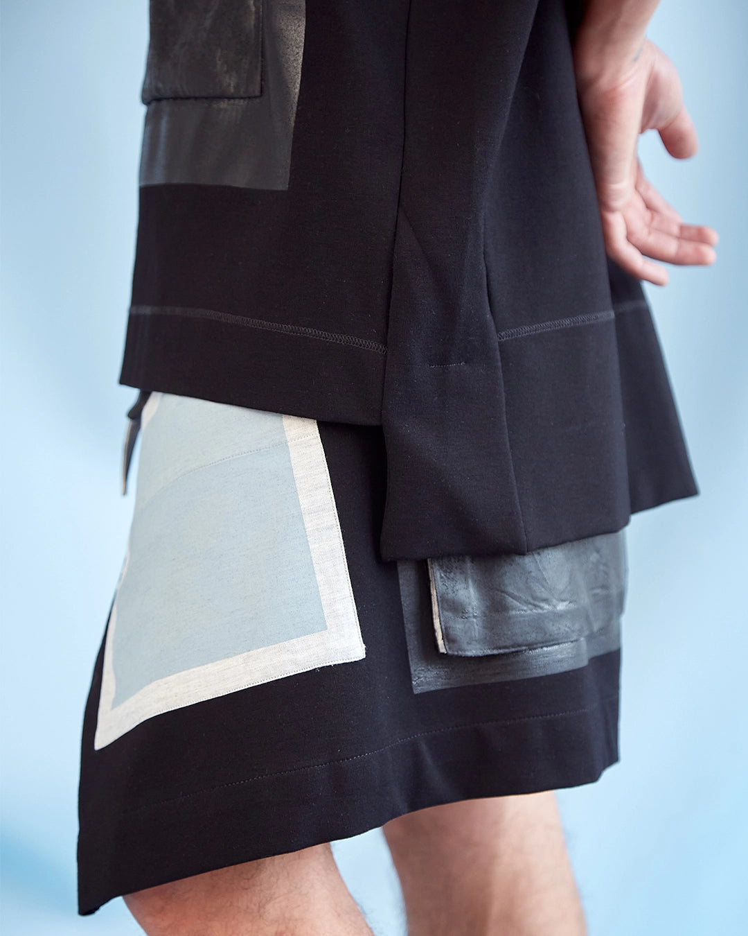 De silueta larga y oversized, esta pieza se construye a partir de un bloque frontal y posterior, unidos por bandas en los hombros. Incluye un cuello tortuga ancho que aporta carácter contemporáneo y un bolsillo plegado en el frente, intervenido con un estampado sobrepuesto que refuerza su singularidad.