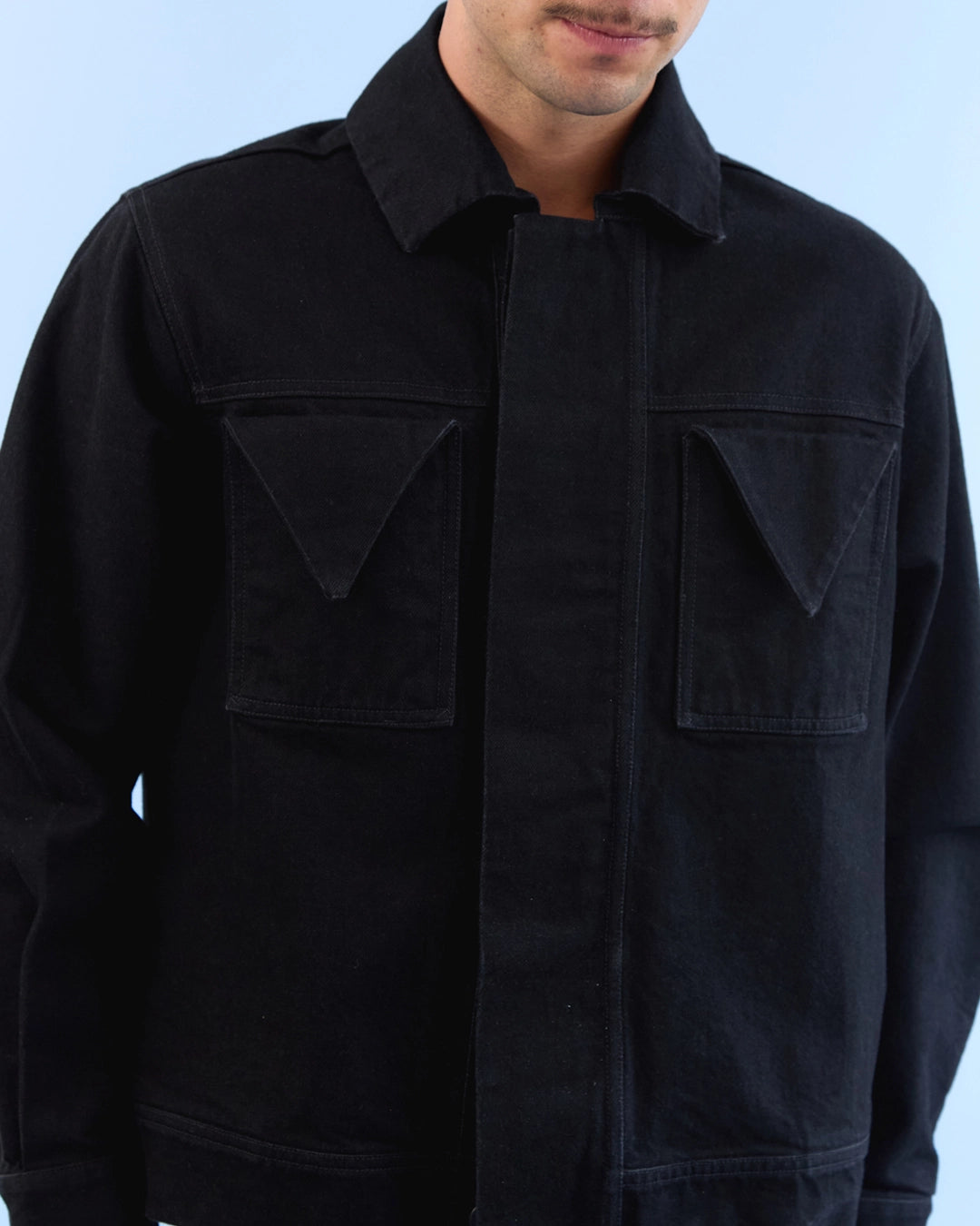 Chaqueta trucker reinterpretada en denim 100% algodón. Silueta limpia y estructurada con bolsillos geométricos y botonadura oculta. Hecha en Colombia.
