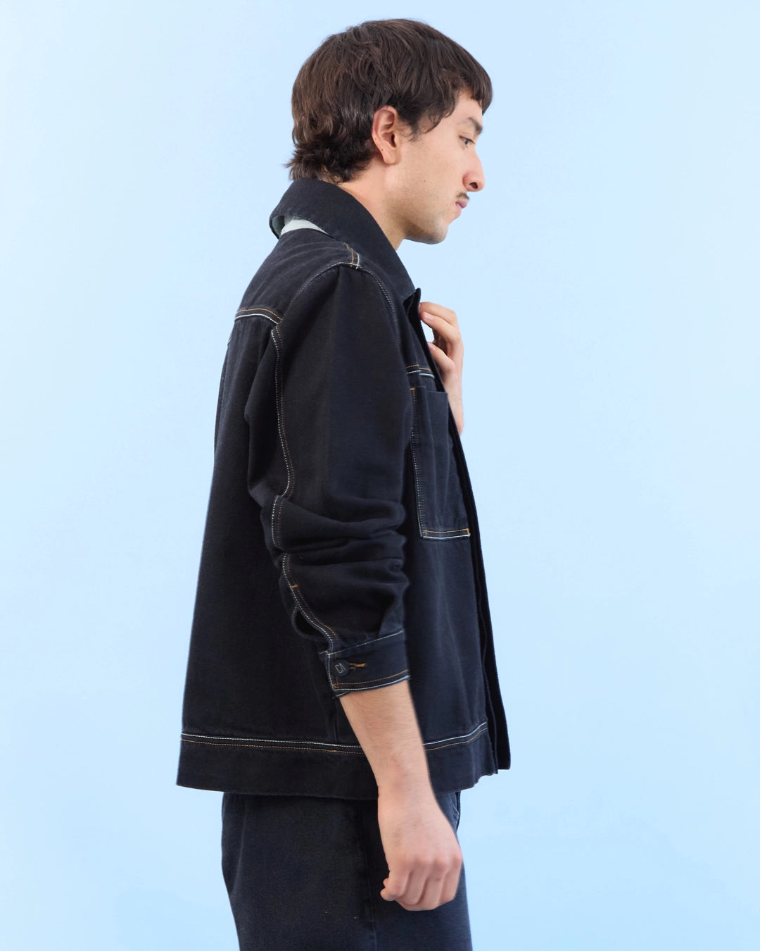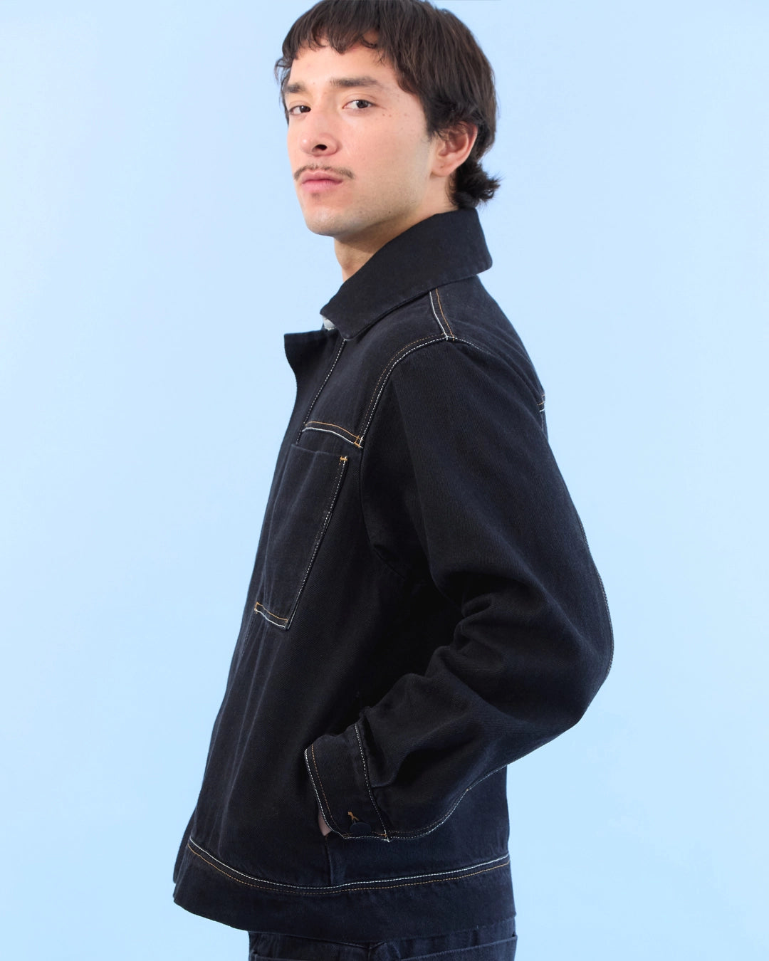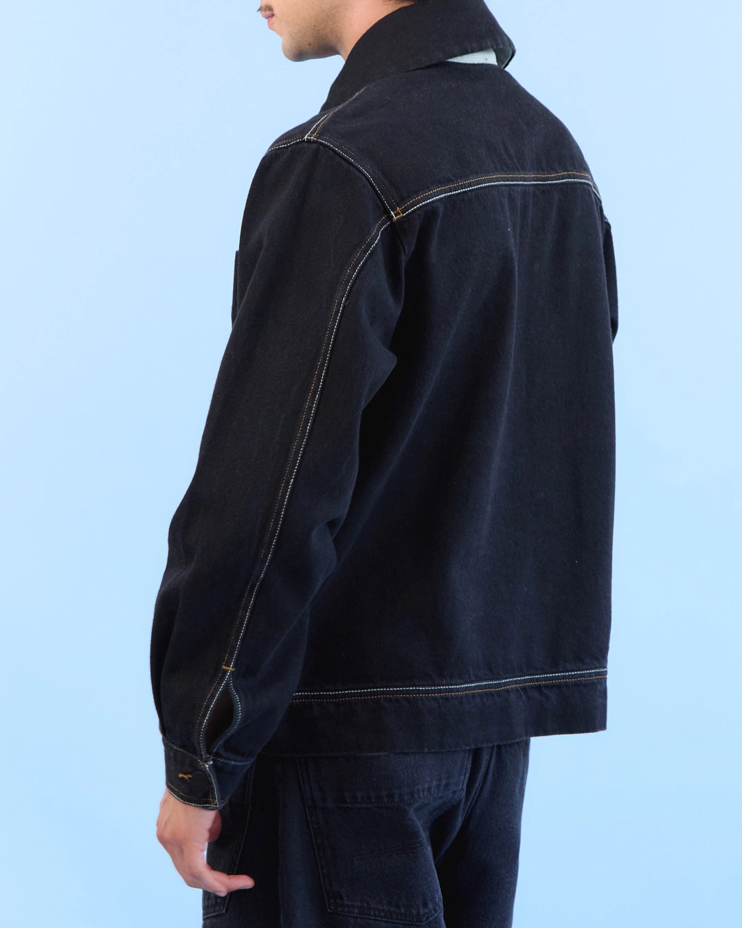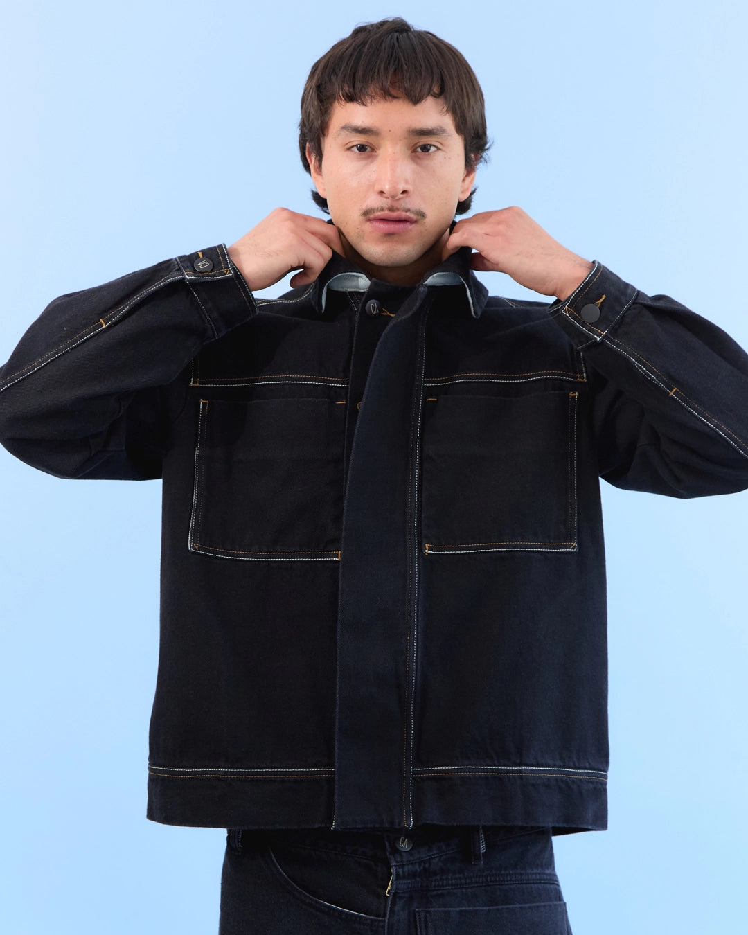 Chaqueta tipo trucker en denim negro de algodón regenerativo, con costuras bicolor en contraste y silueta estructurada. Hecha en Colombia con prácticas sostenibles.