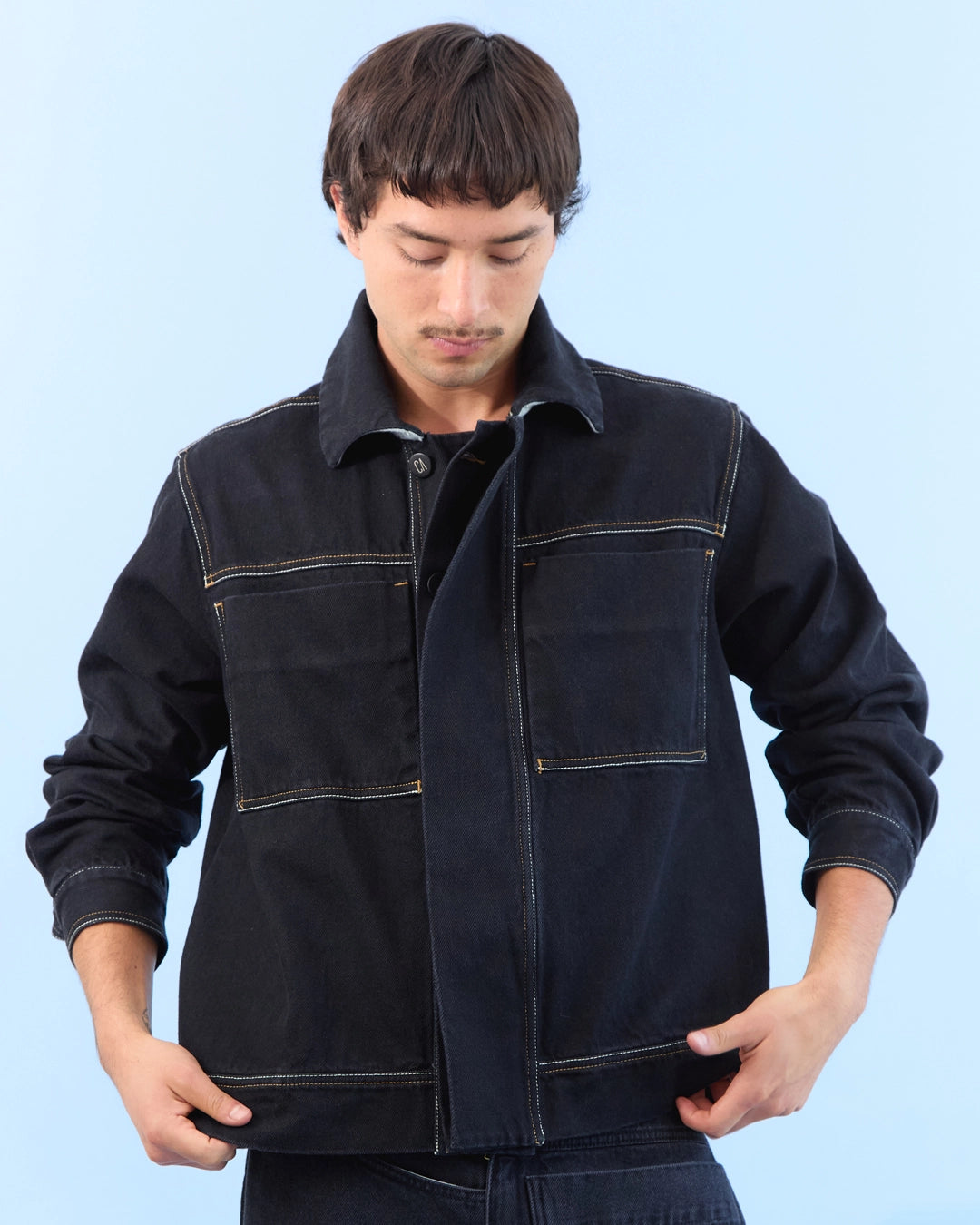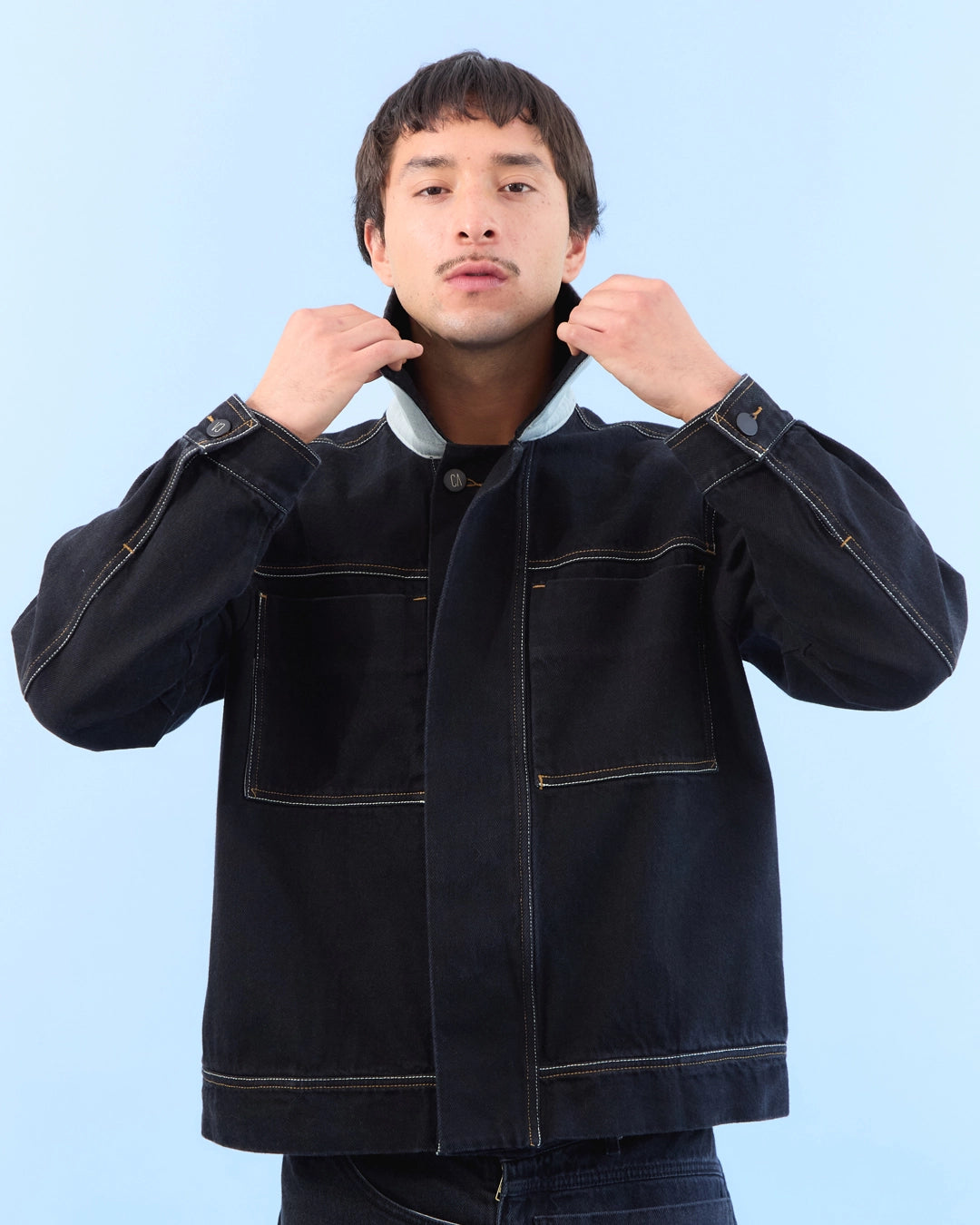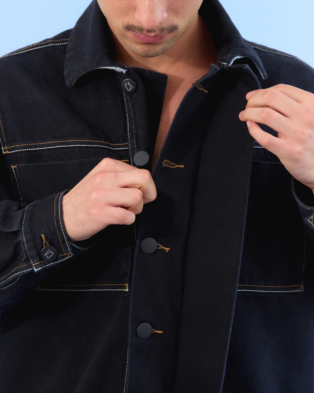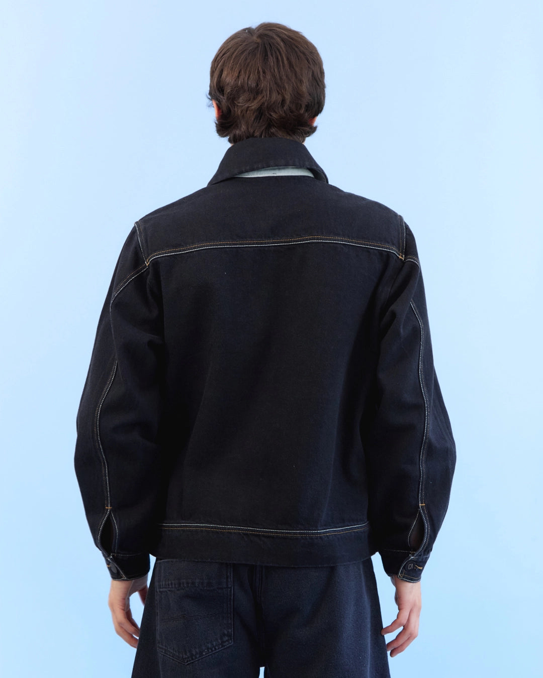 Chaqueta tipo trucker en denim negro de algodón regenerativo, con costuras bicolor en contraste y silueta estructurada. Hecha en Colombia con prácticas sostenibles.