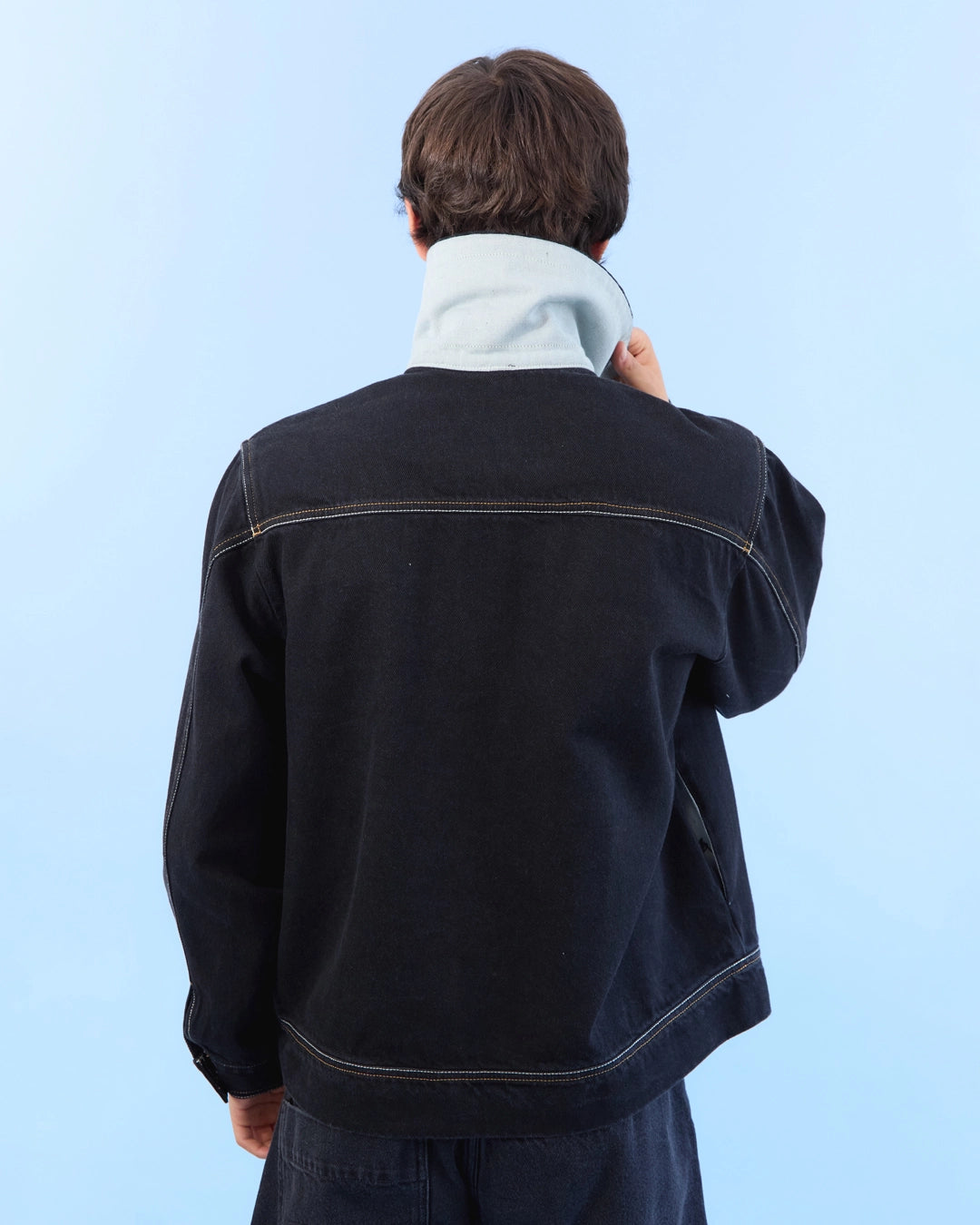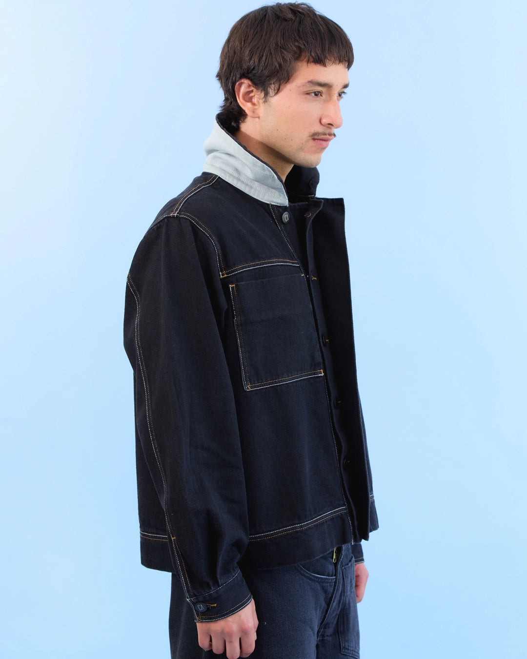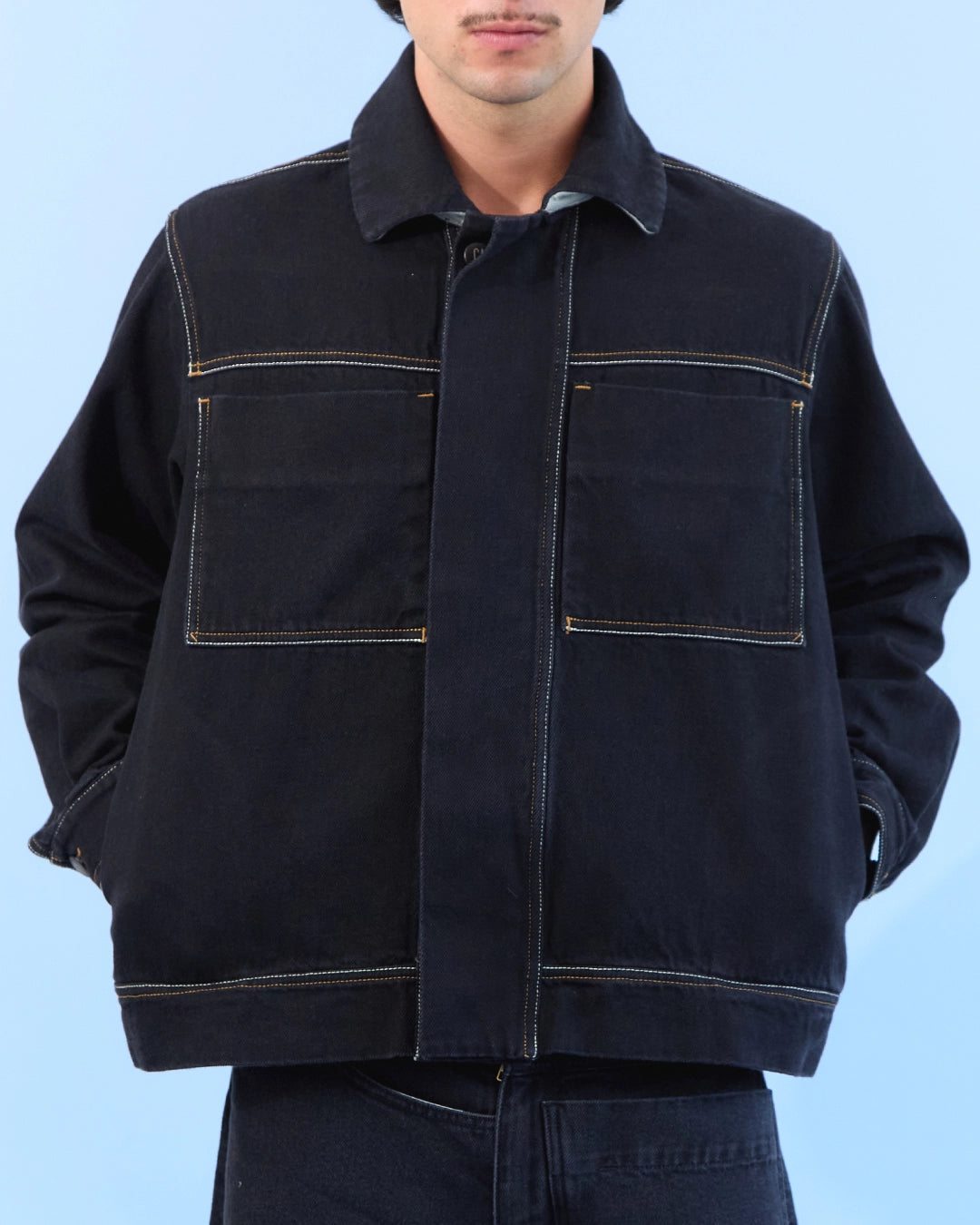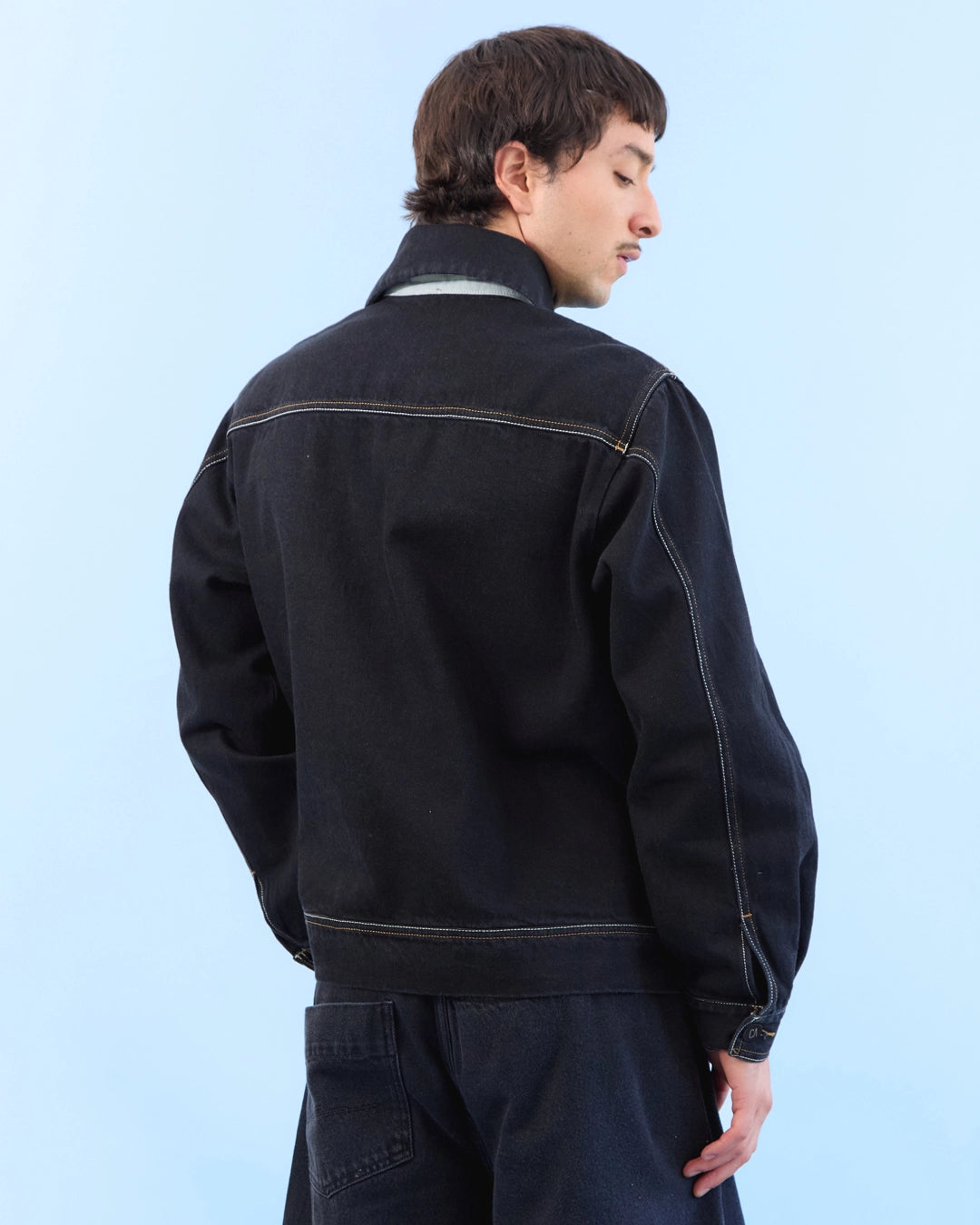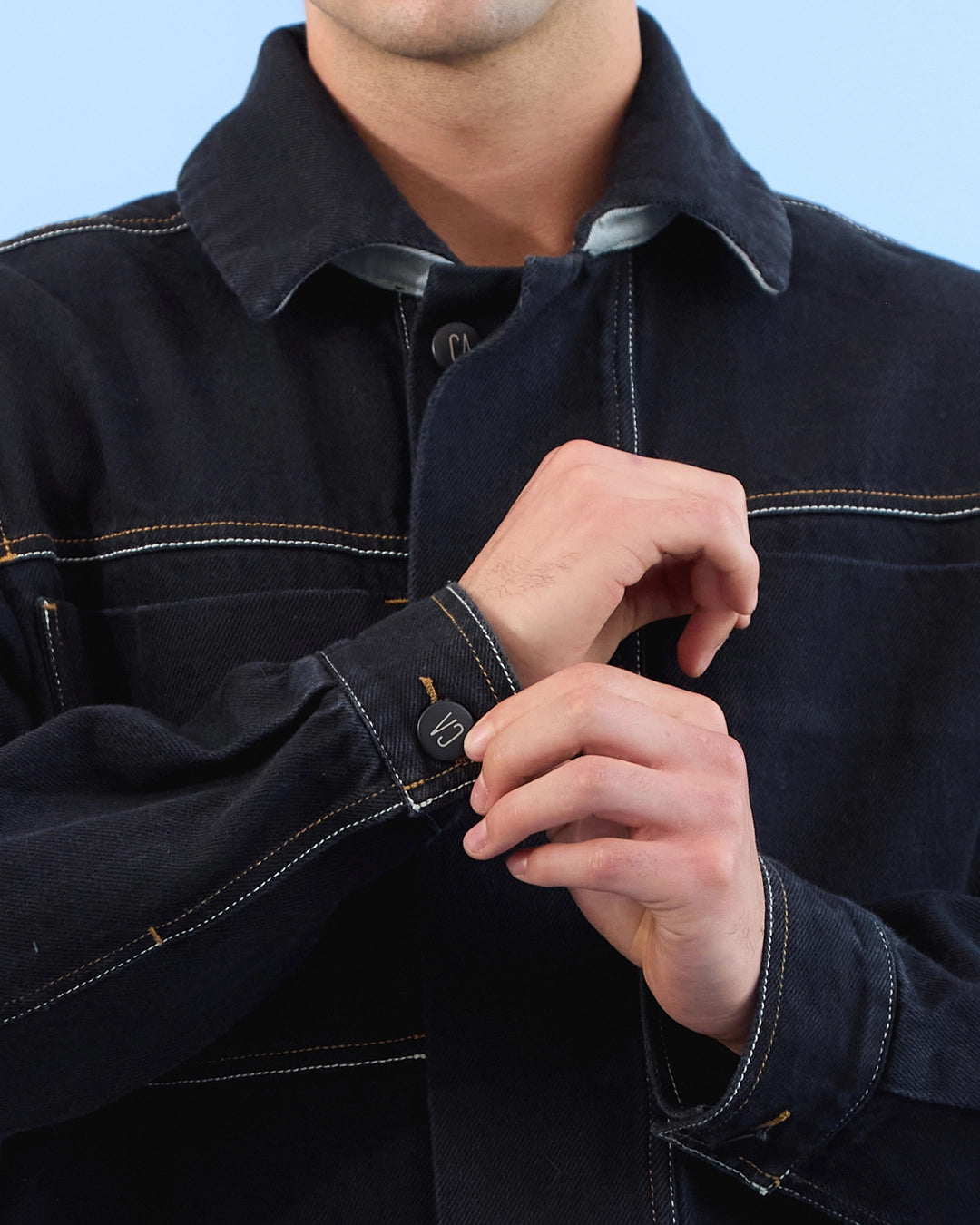 Chaqueta tipo trucker en denim negro de algodón regenerativo, con costuras bicolor en contraste y silueta estructurada. Hecha en Colombia con prácticas sostenibles.