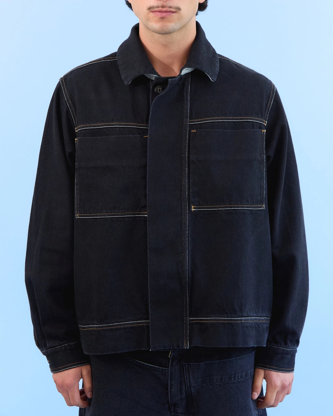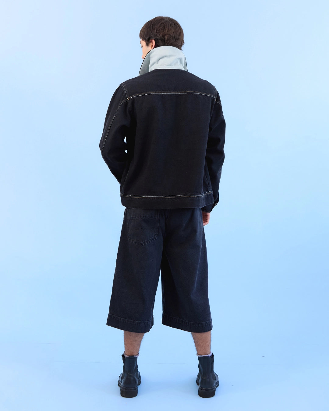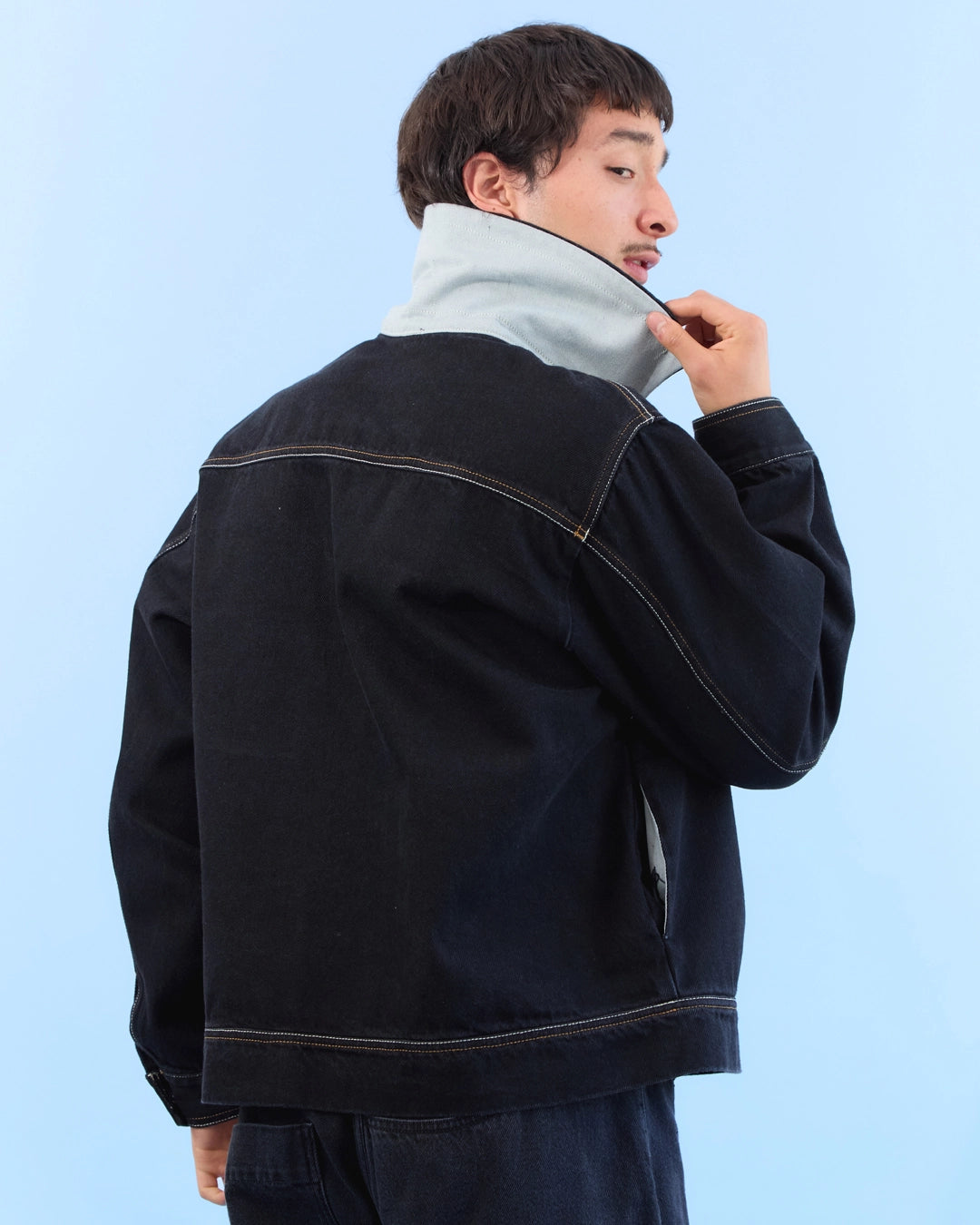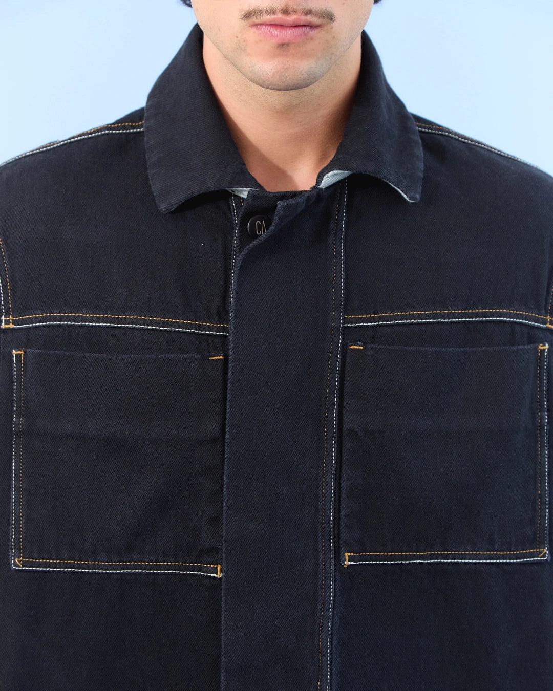 Chaqueta tipo trucker en denim negro de algodón regenerativo, con costuras bicolor en contraste y silueta estructurada. Hecha en Colombia con prácticas sostenibles.
