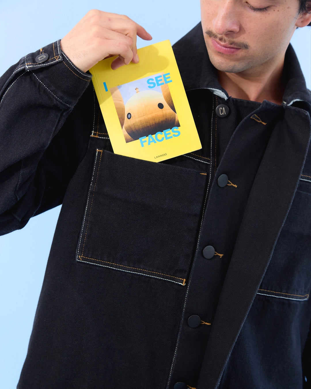 Denim negro suavizado, con tela más clara que contraste en forros internos y revés del cuello. Costuras de realce en dos colores: ocre y menta, que contrastan con el color negro del textil.