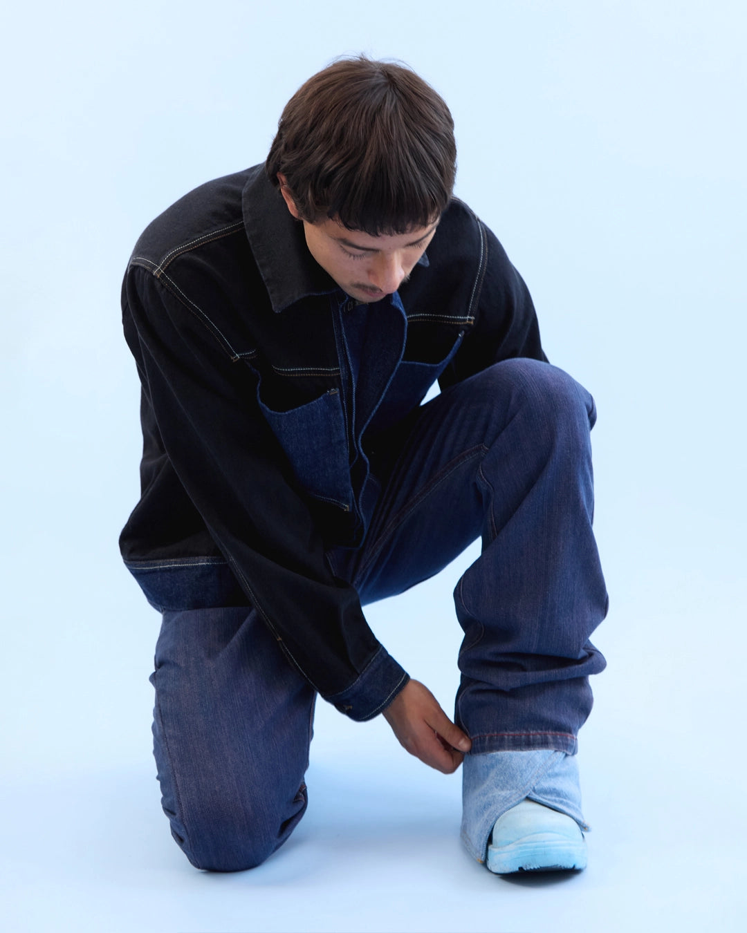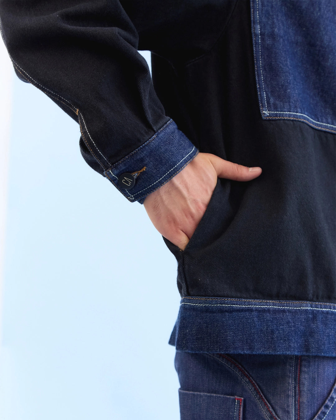 Chaqueta en denim de algodón regenerativo con bloques de color negro e índigo. Diseño tipo trucker con costuras bicolor y estructura limpia. Hecha en Colombia.