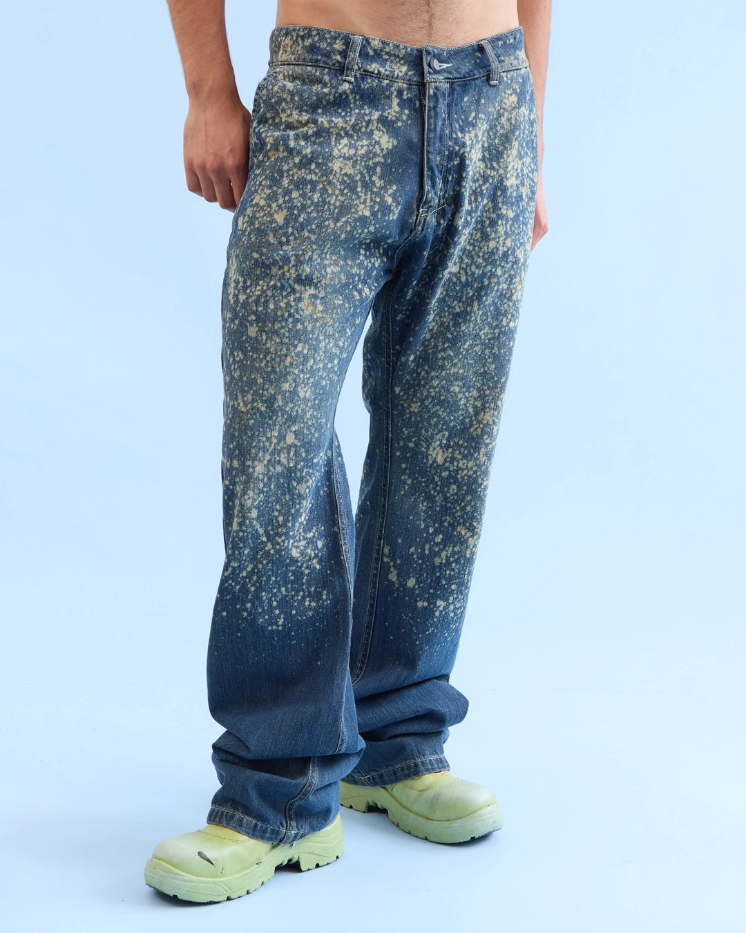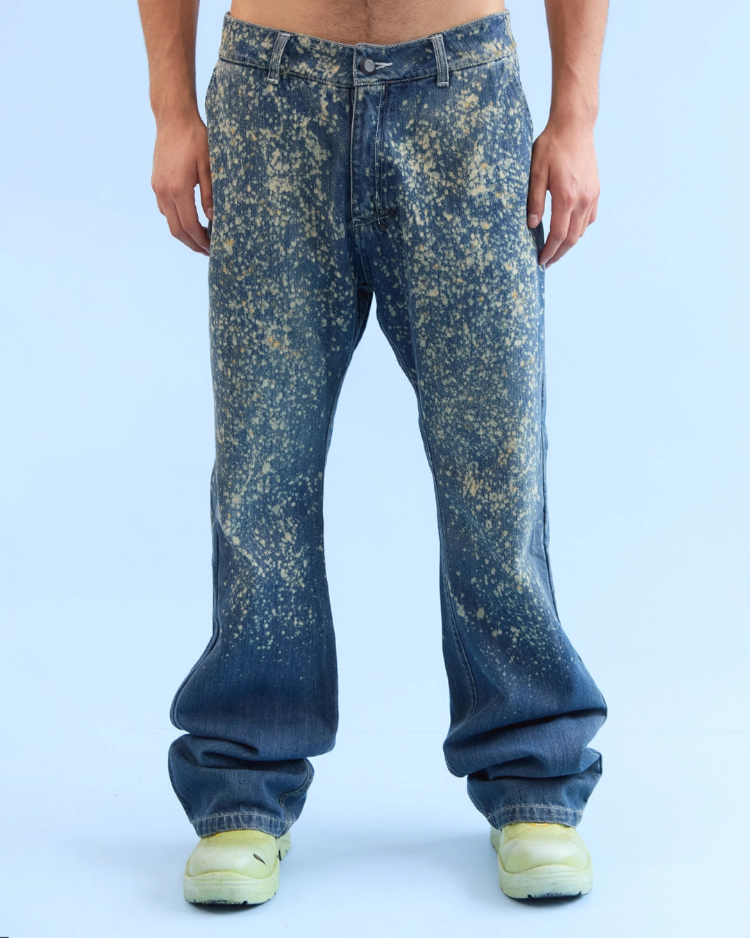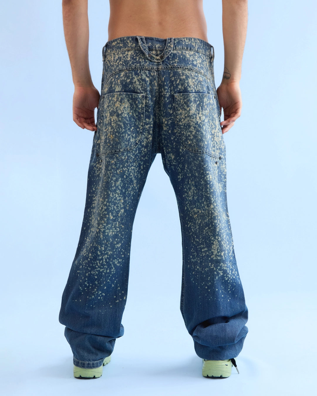 Jean en denim índigo 100% algodón con efecto de salpicado tipo galaxia. Intervención textil manual, cada pieza es única. Hecho en Colombia.