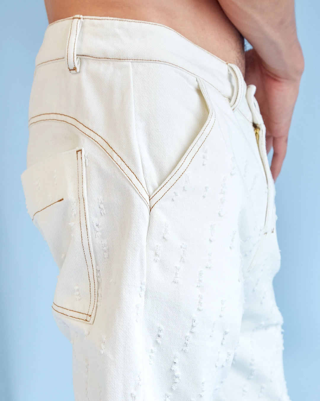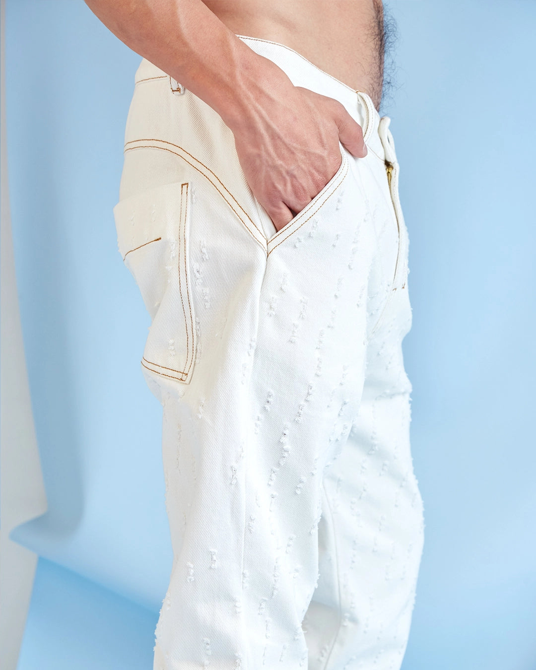 Pantalón en denim natural con perforaciones láser.
