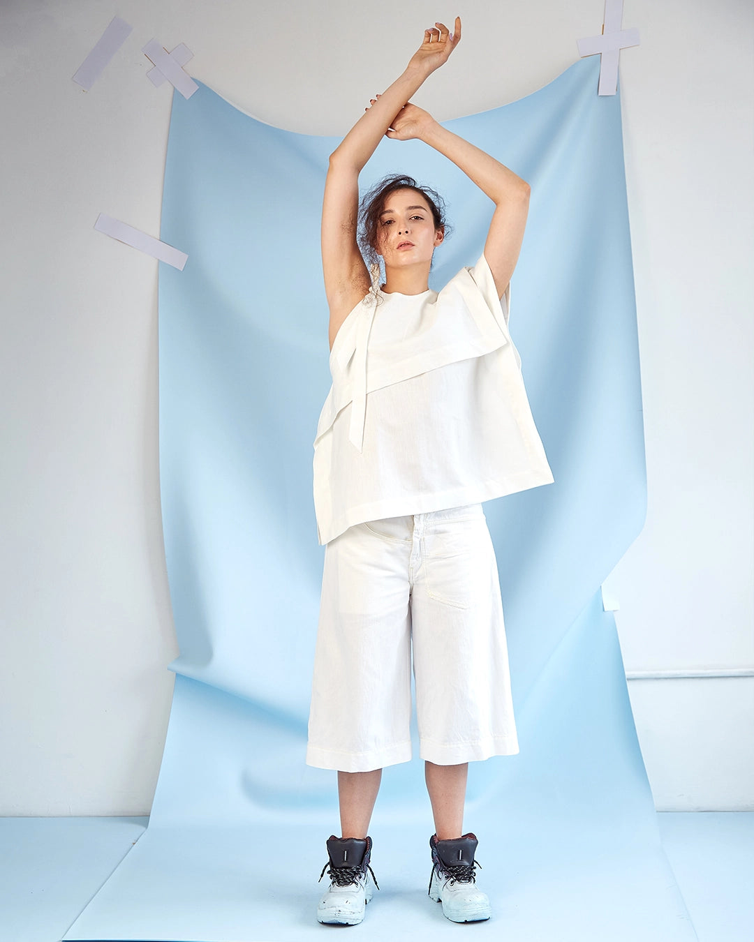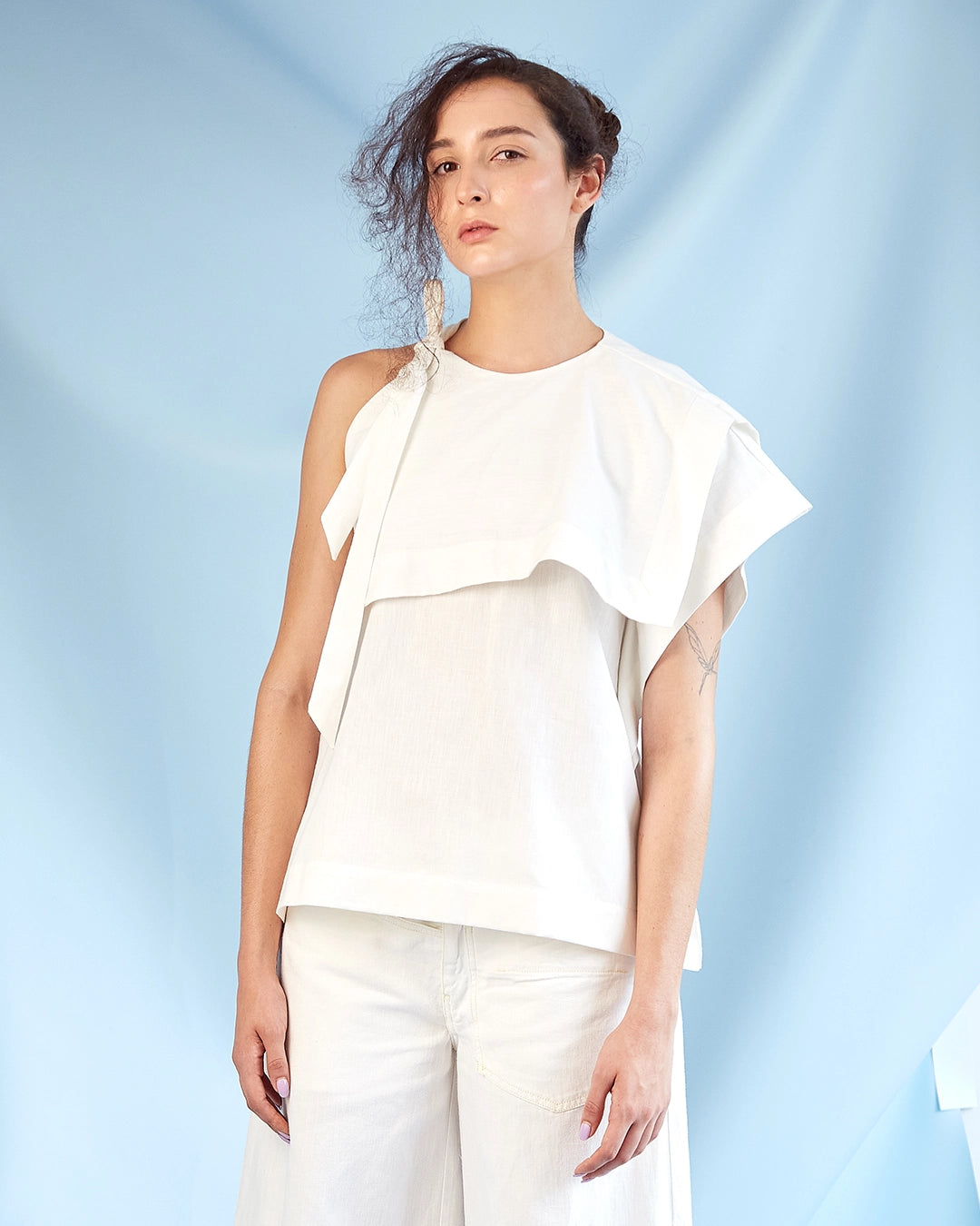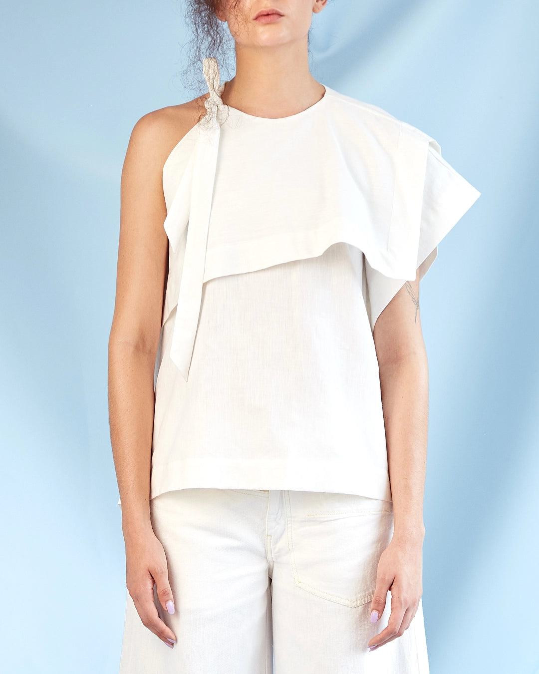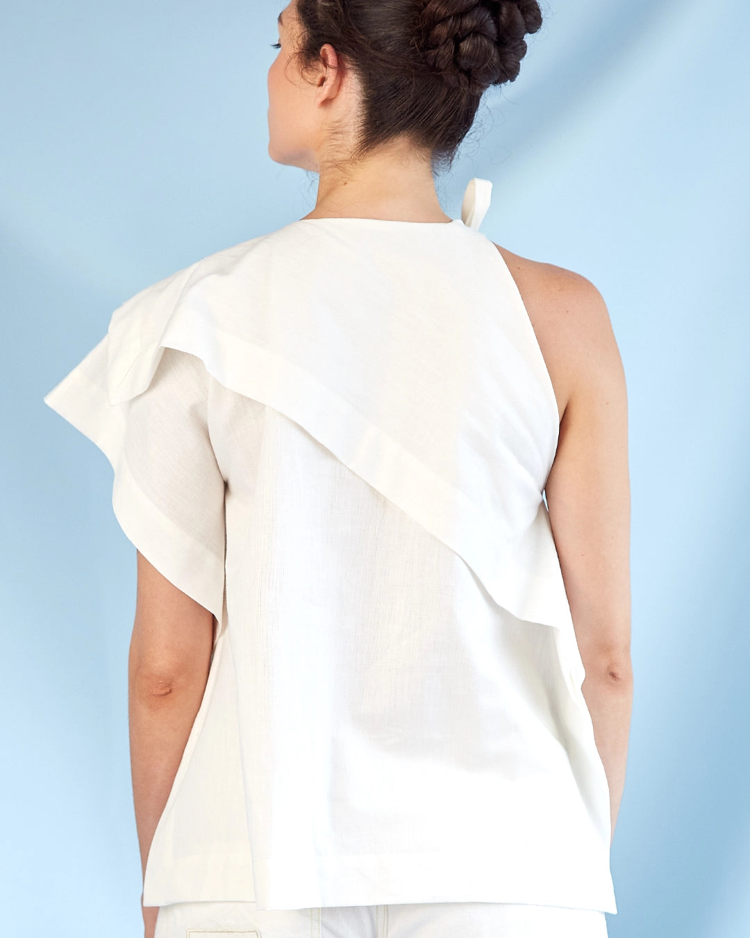 Top asimétrico en algodón y cáñamo, con silueta boxy y diseño de bajo desperdicio textil. Parte de la línea rectangular, hecha en Colombia con materiales naturales y sostenibles.