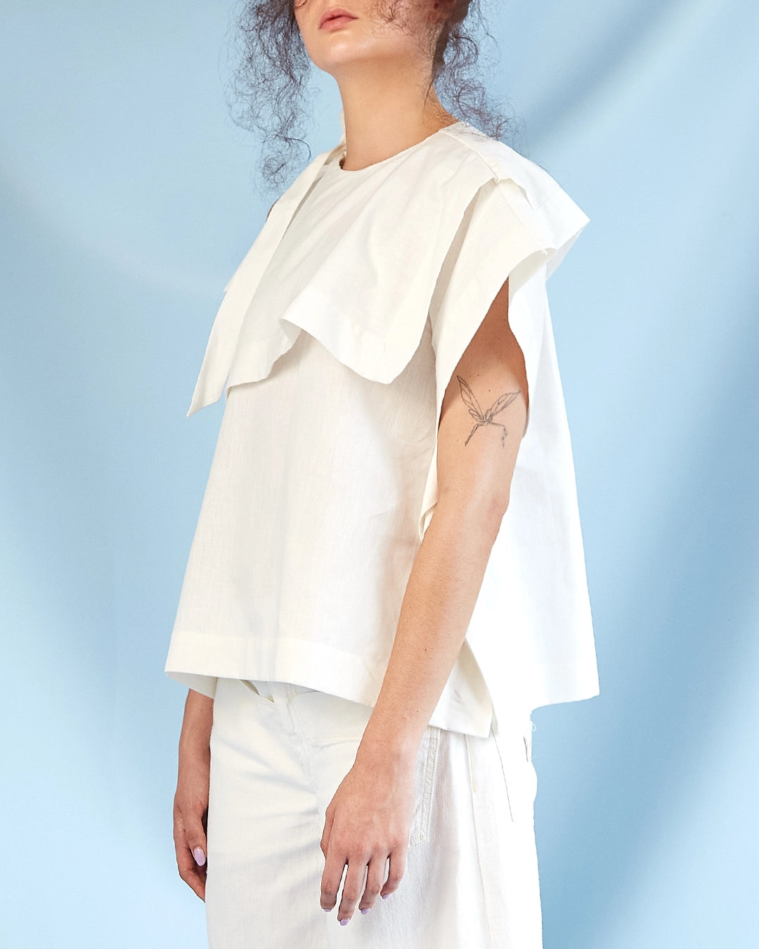 Top en color marfil natural elaborado en una mezcla de 66% algodón y 34% cáñamo. El cáñamo es una fibra vegetal que crece rápido, mejora el suelo y no necesita pesticidas, lo que convierte esta pieza en una alternativa responsable y sostenible.