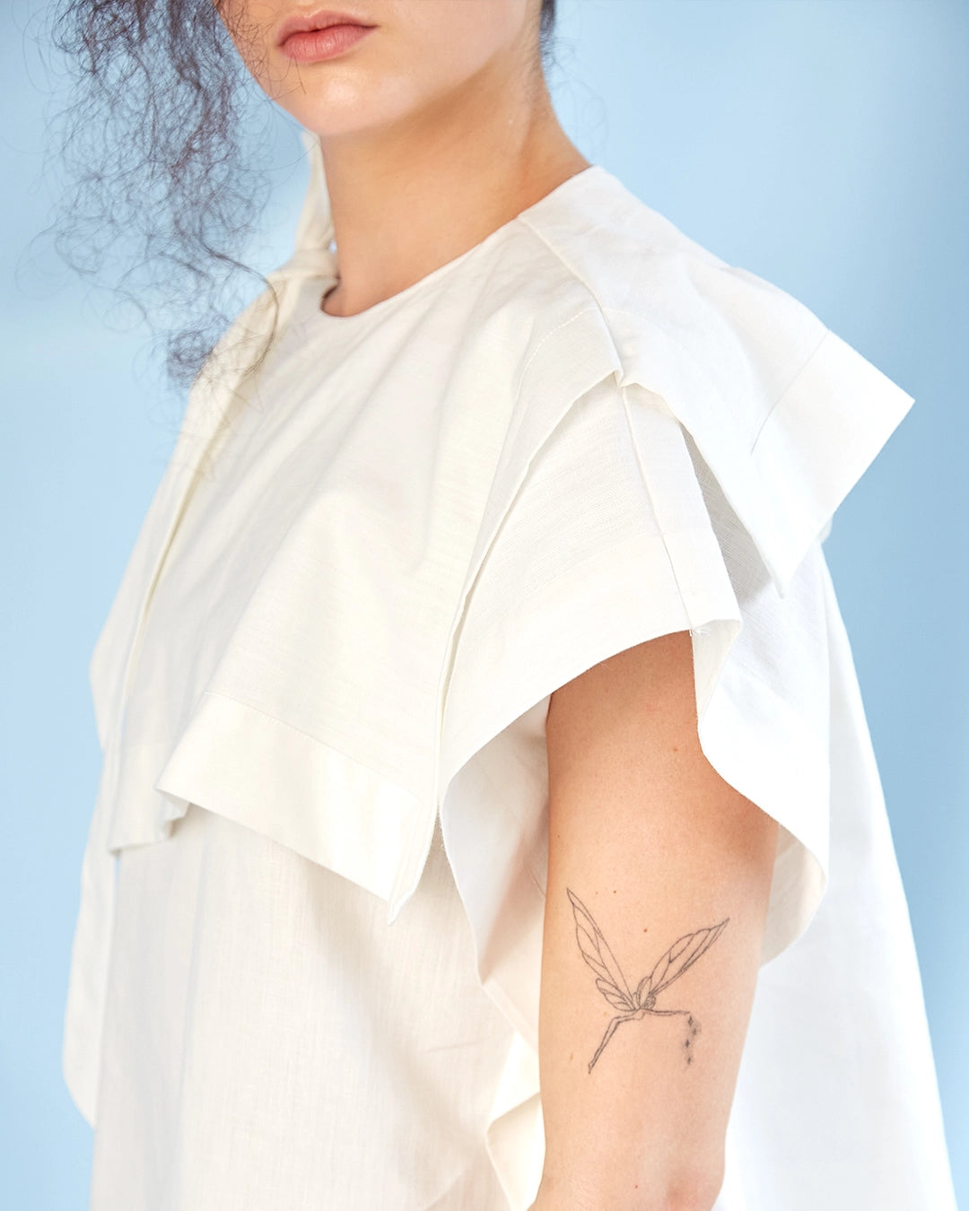 Su diseño asimétrico parte de un rectángulo de tela plegado estratégicamente en el frente y la espalda para formar el cuello y la sisa, evitando desperdicios de material. El hombro derecho tiene una manga sisa diagonal que se ajusta con una tira para anudar, mientras que el lado izquierdo incorpora una manga rodada con doble capa. El ruedo ancho y su silueta tipo boxy aportan un carácter relajado y contemporáneo.