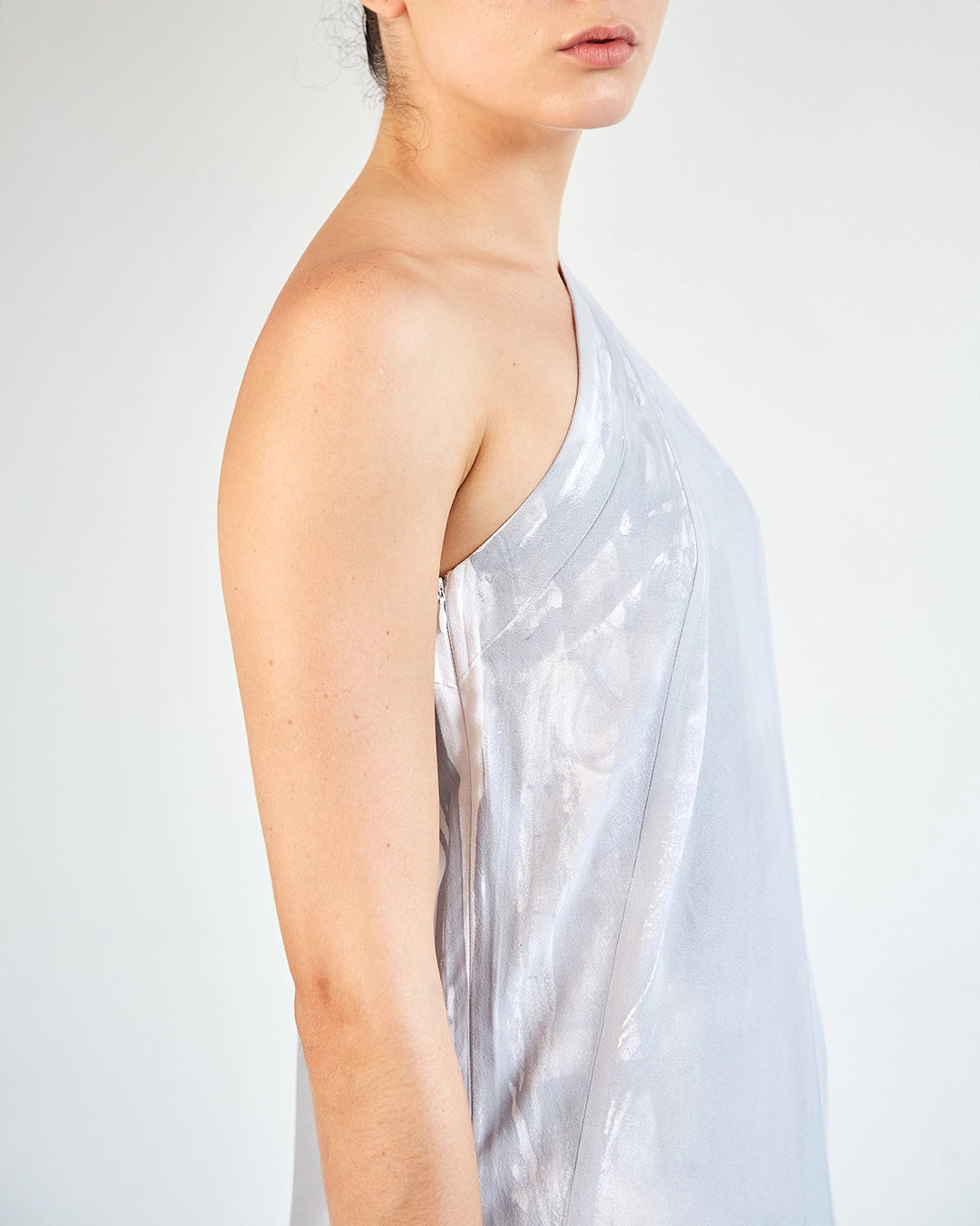 Vestido asimétrico de un solo hombro en rayón viscosa con estampado gris perla. Prenda circular creada a partir de un prototipo de 2018 y reimaginada con estampación experimental. Hecho en Colombia.