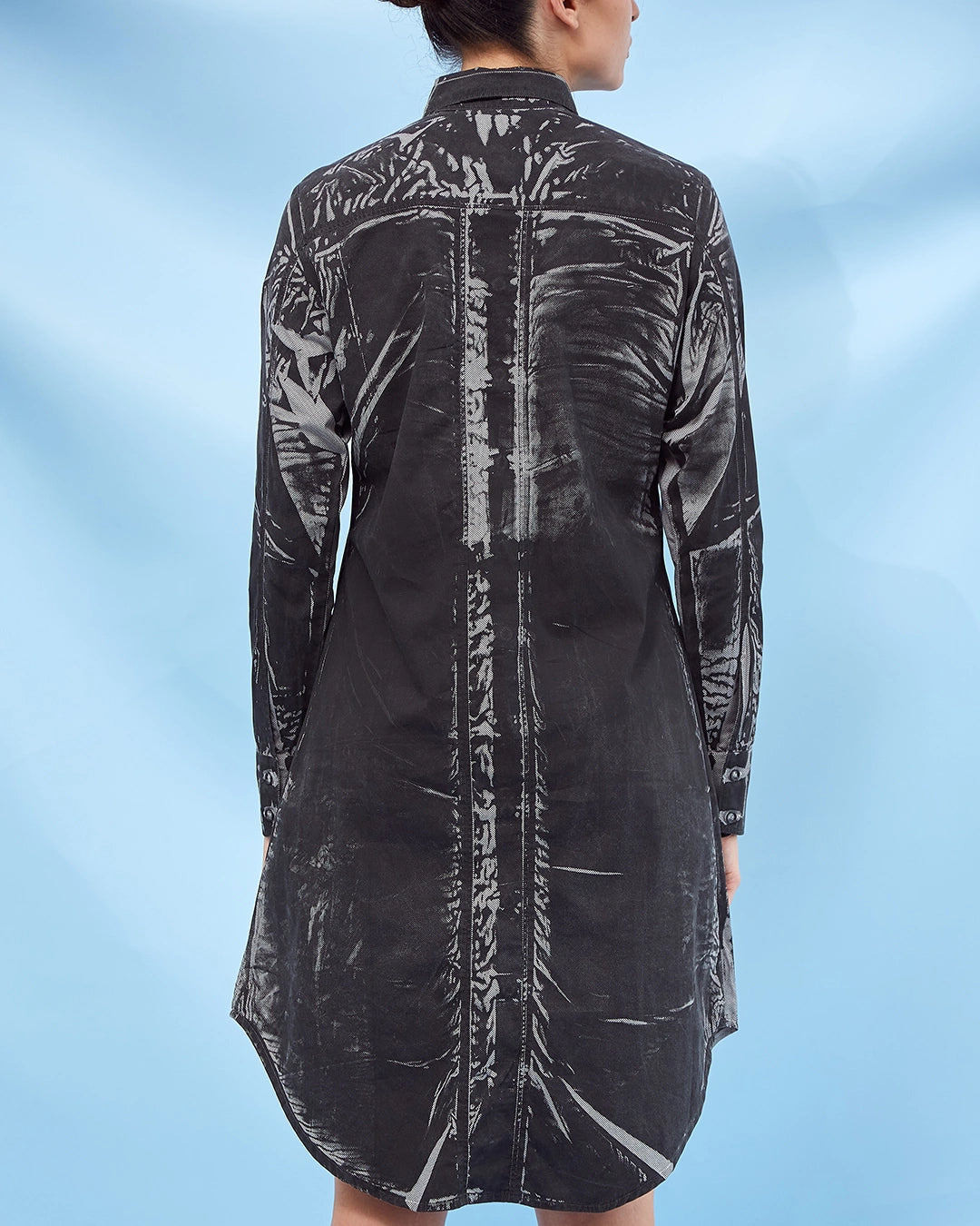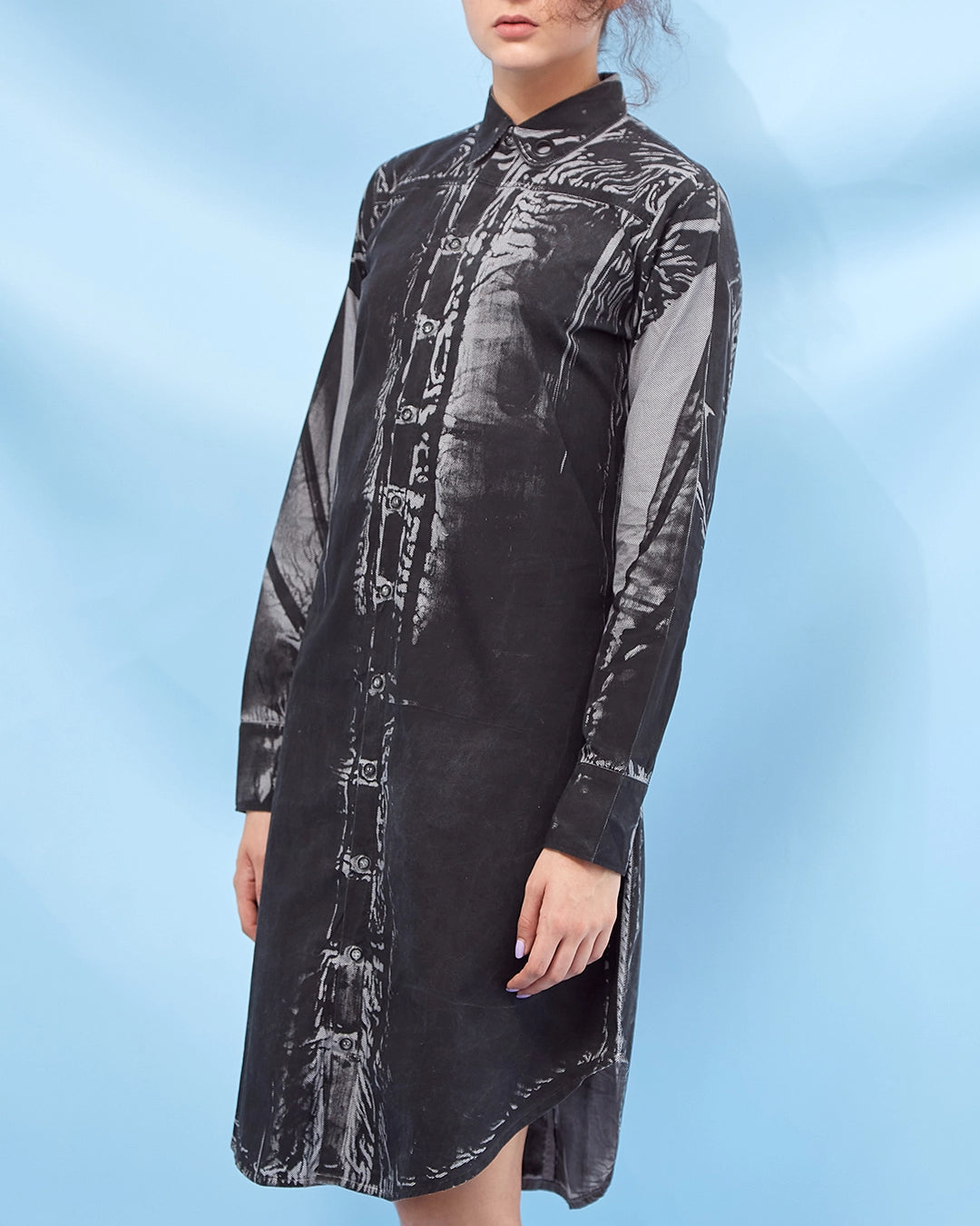 Vestido camisero en algodón con cuello asimétrico y ruedo curvo. Pieza de la línea circular, recuperada de archivo e intervenida con estampación experimental. Hecho en Colombia.