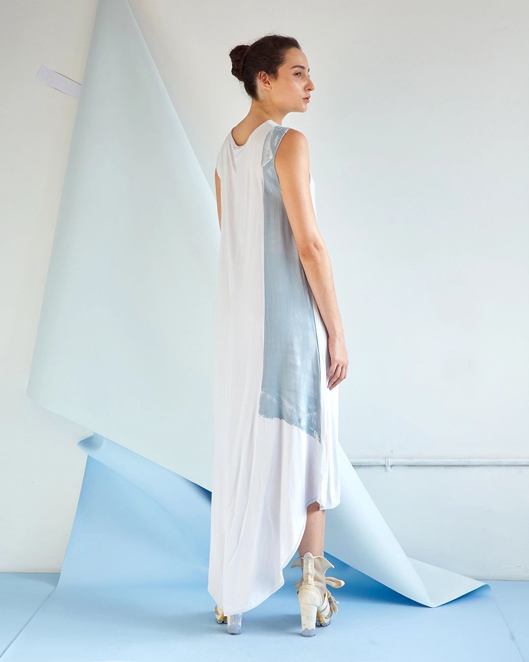 Vestido largo sin mangas en rayón-viscosa con capas sobrepuestas y ruedo irregular. Prenda de la línea circular, recuperada de archivo e intervenida con estampación experimental. Hecho en Colombia.